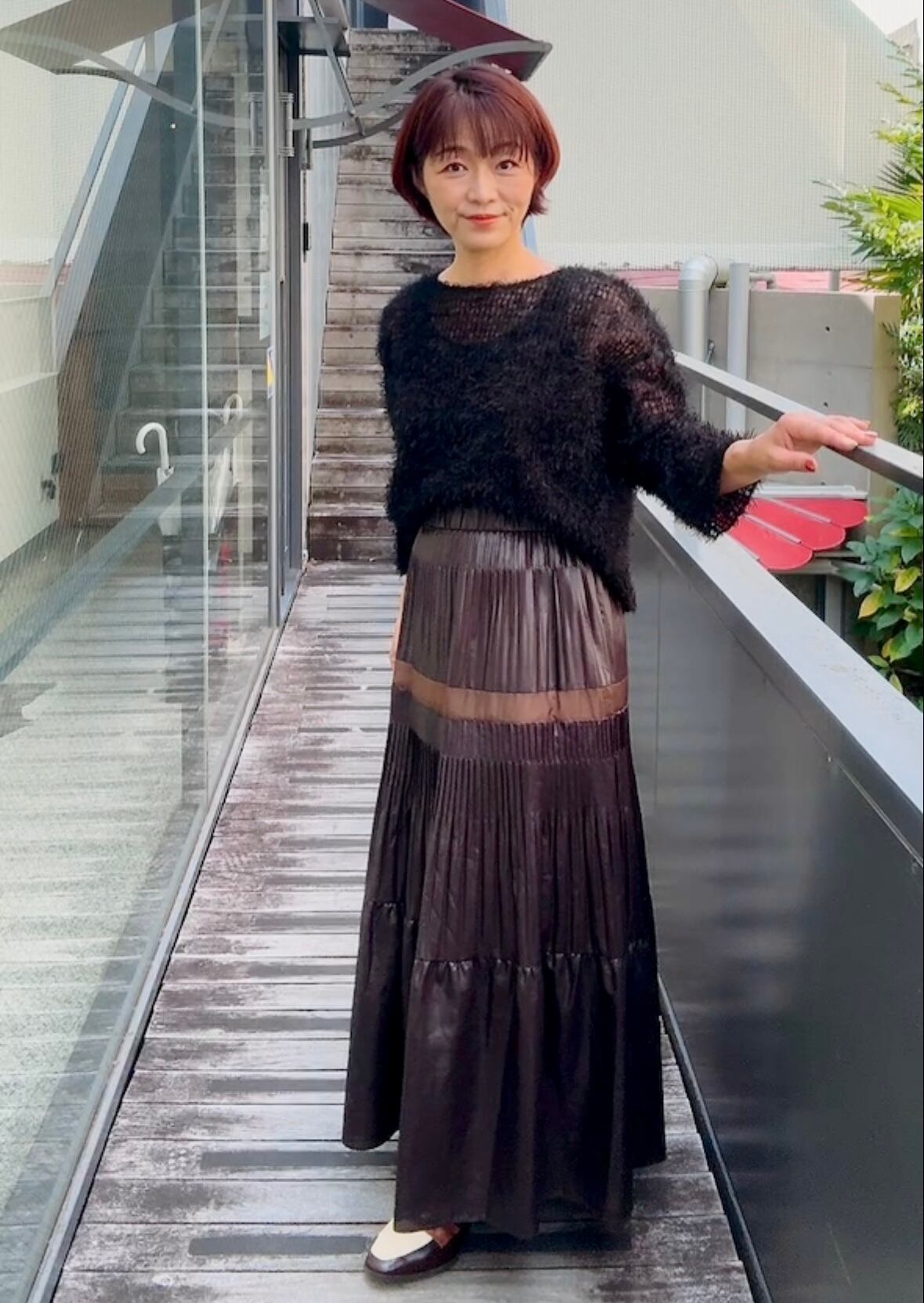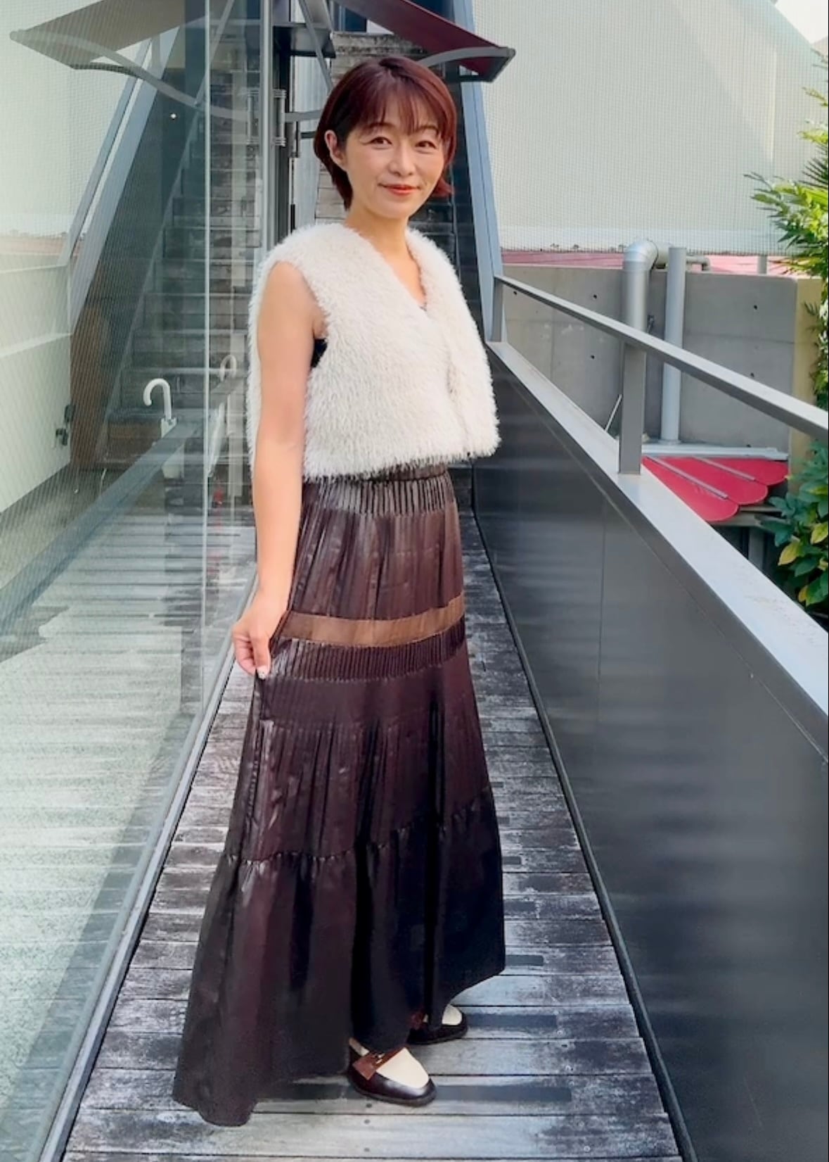 なびく様がエレガント。ハリケーンプリーツという変則的な消しプリーツ加工を贅沢にも3段使用した特別感のあるプリーツスカート。