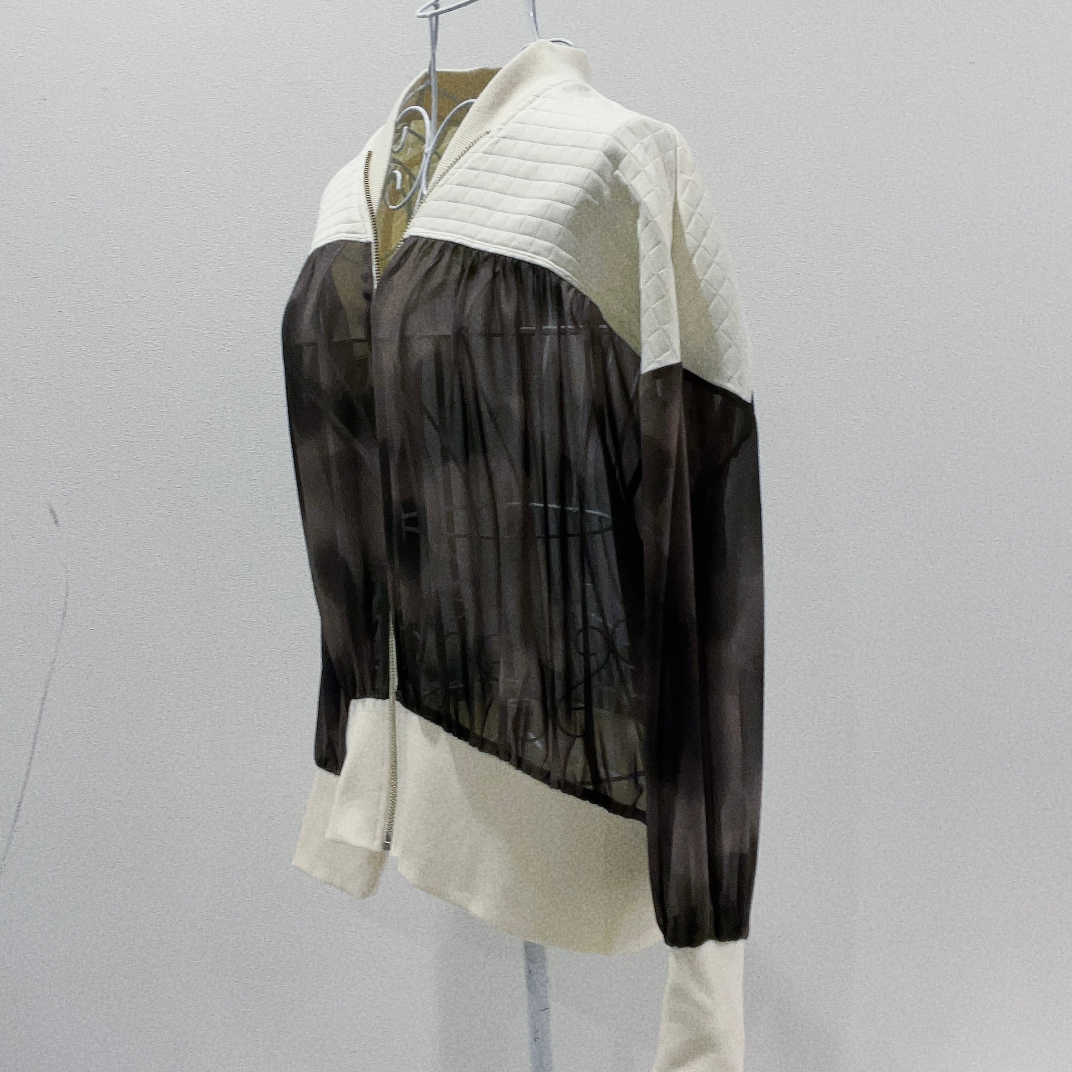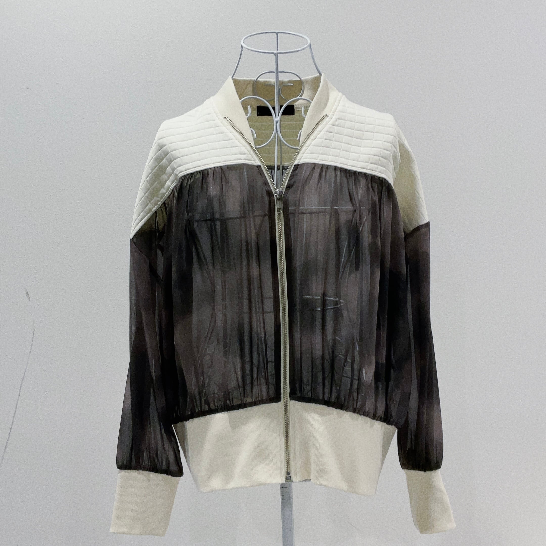 キルティング素材と透け感のあるシアー素材を大胆に切り替え、軽やかさとモード感を兼ね備えた一着です。