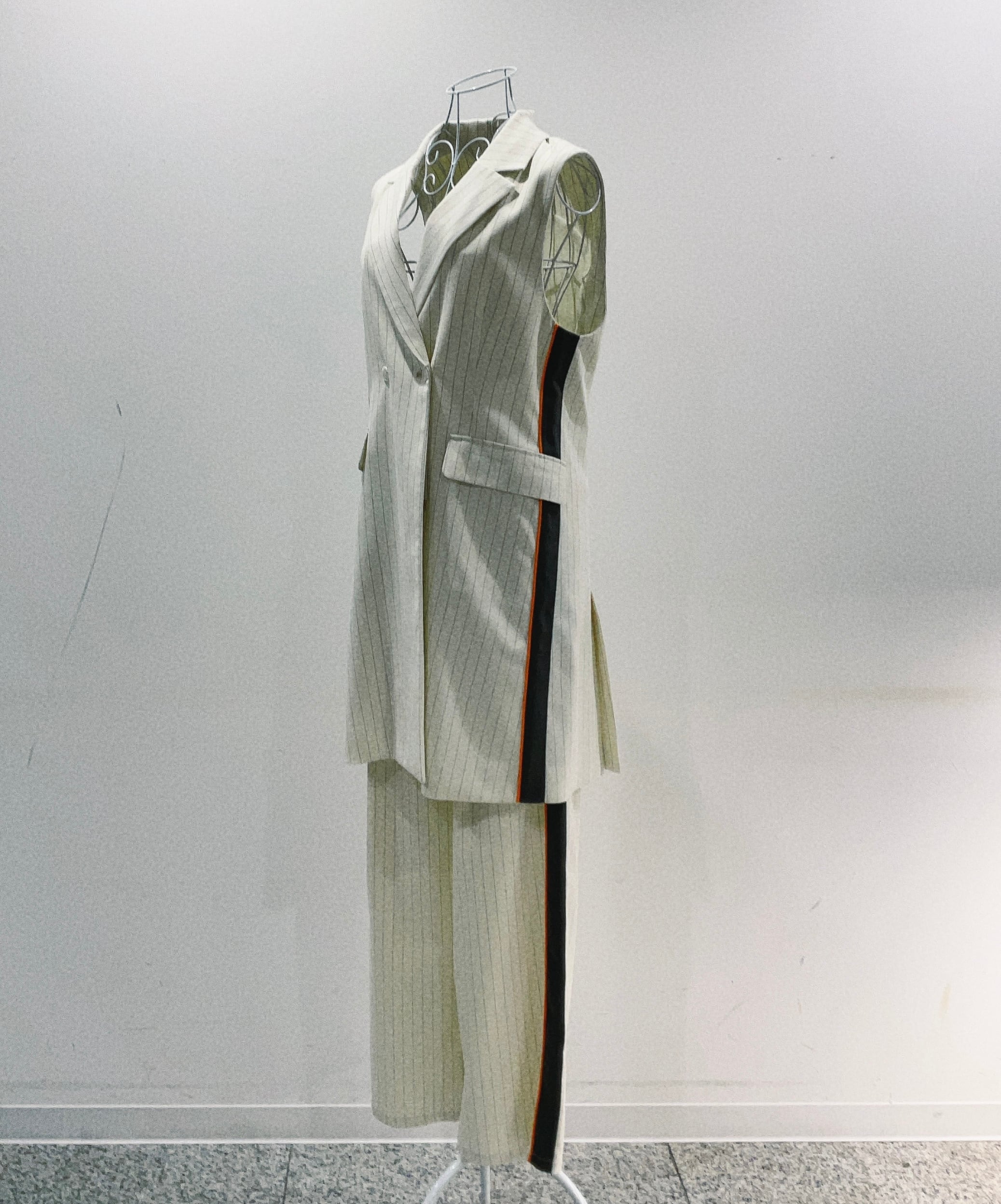 マニッシュなピンストライプに、サイドラインで程よくエッジを効かせた