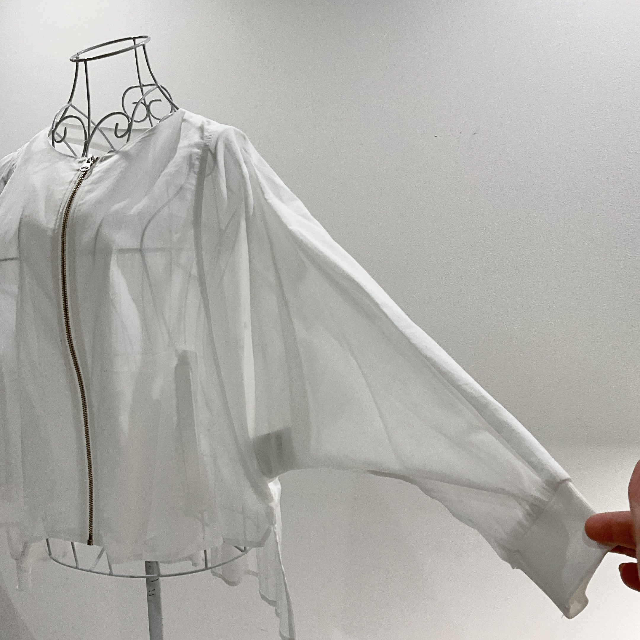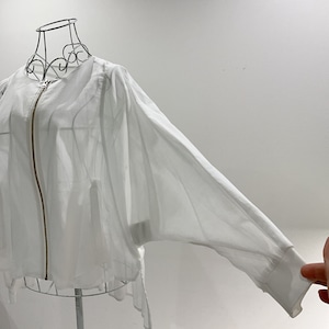 やわらかな透け感が魅力の、シアー素材を使用したジップブラウス。
