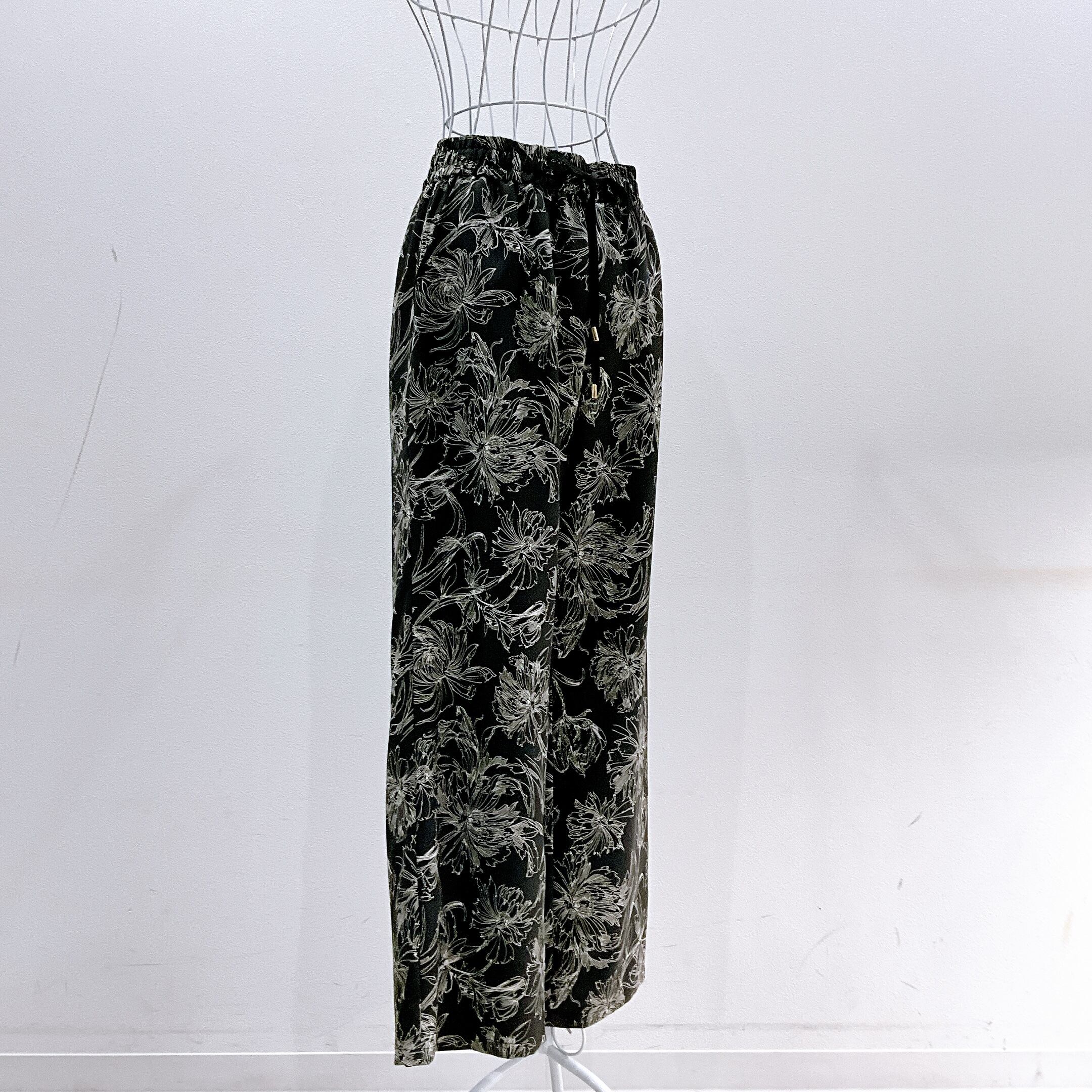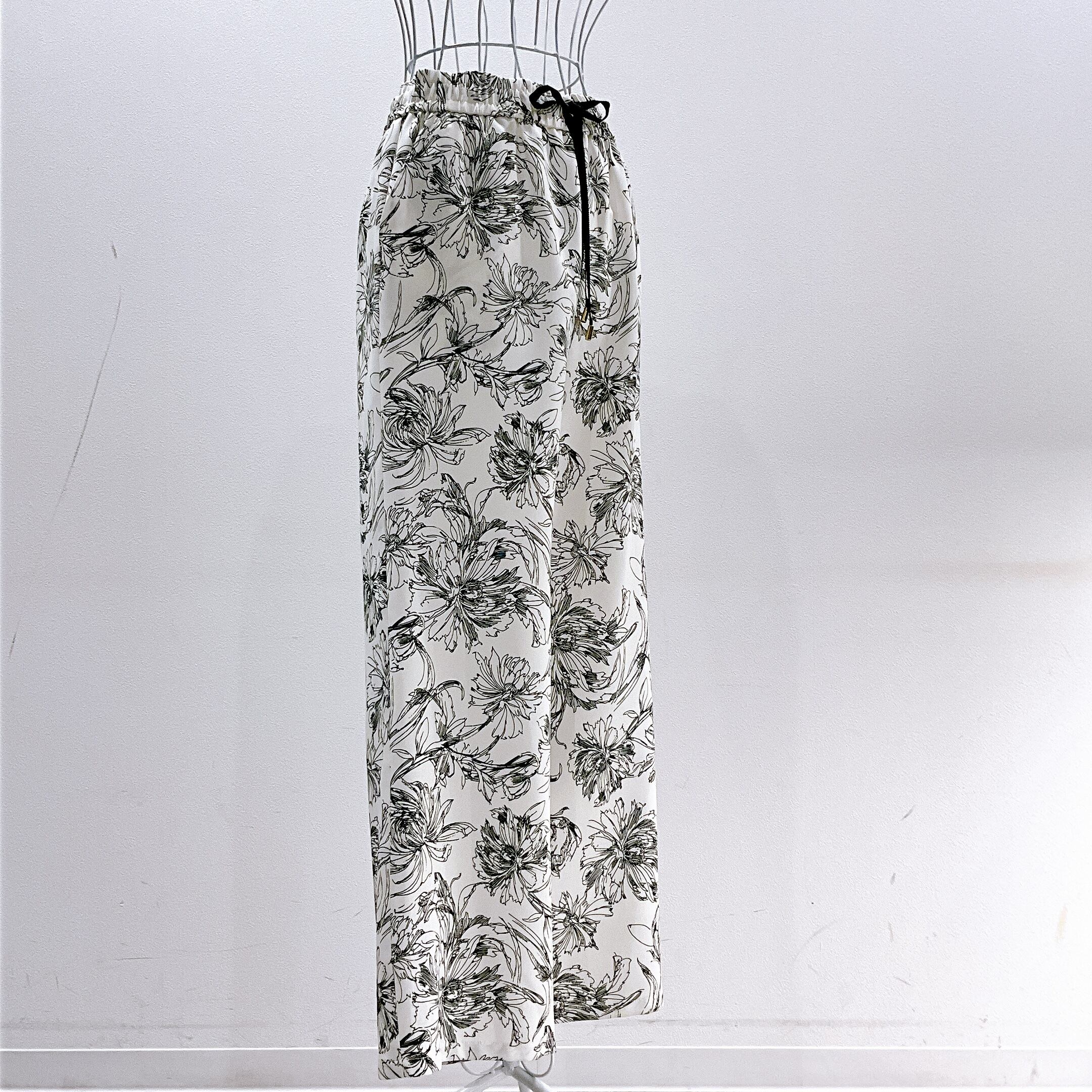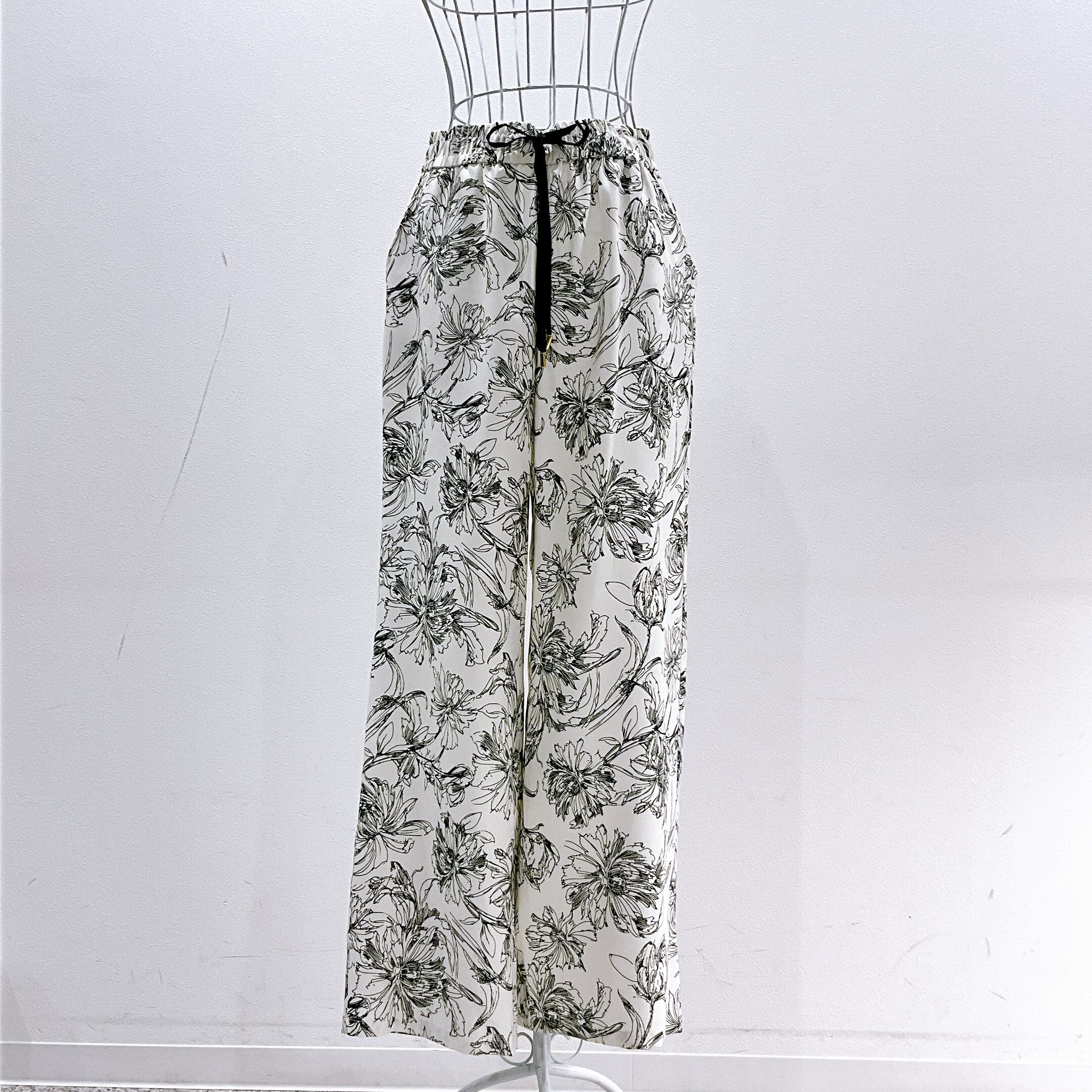 繊細な線画タッチのフラワープリントが目を惹く、大人の柄パンツ。