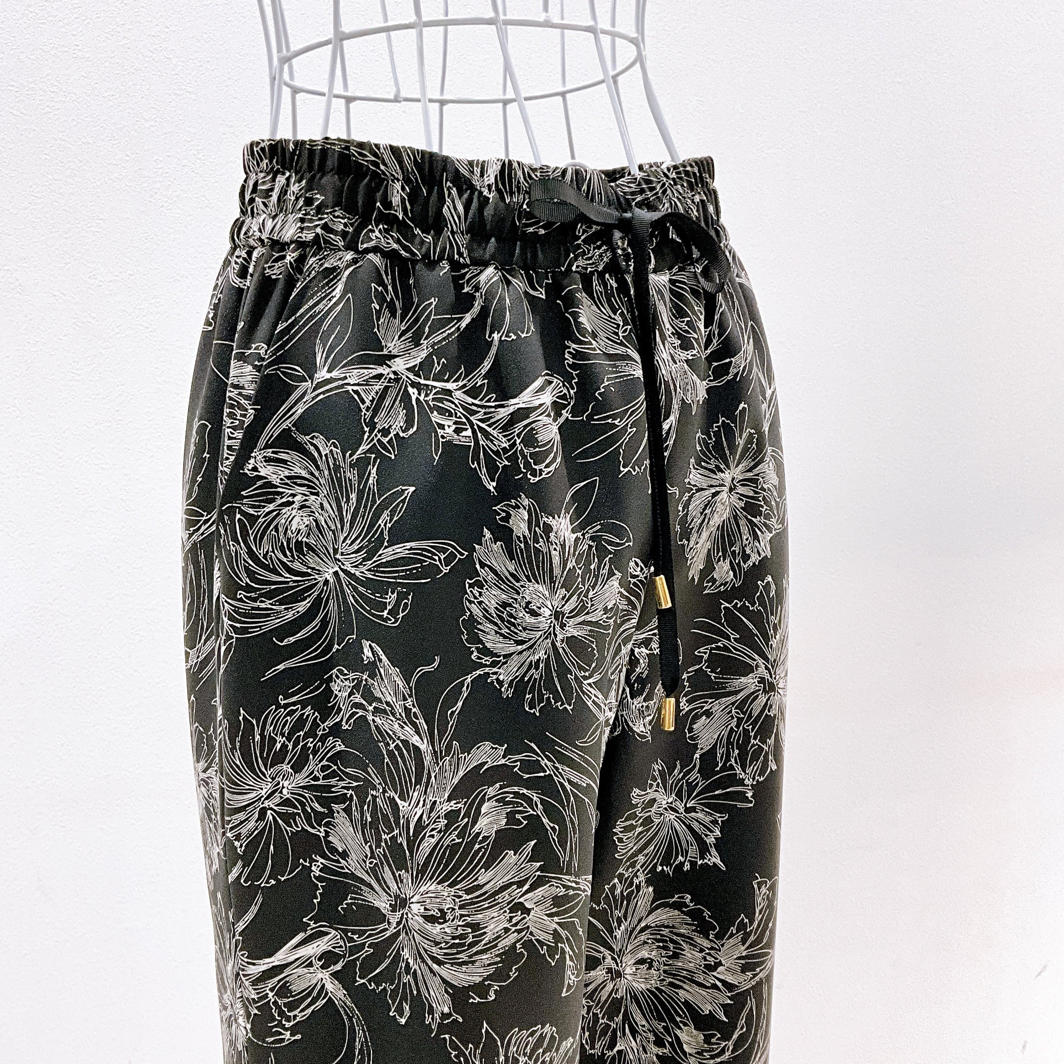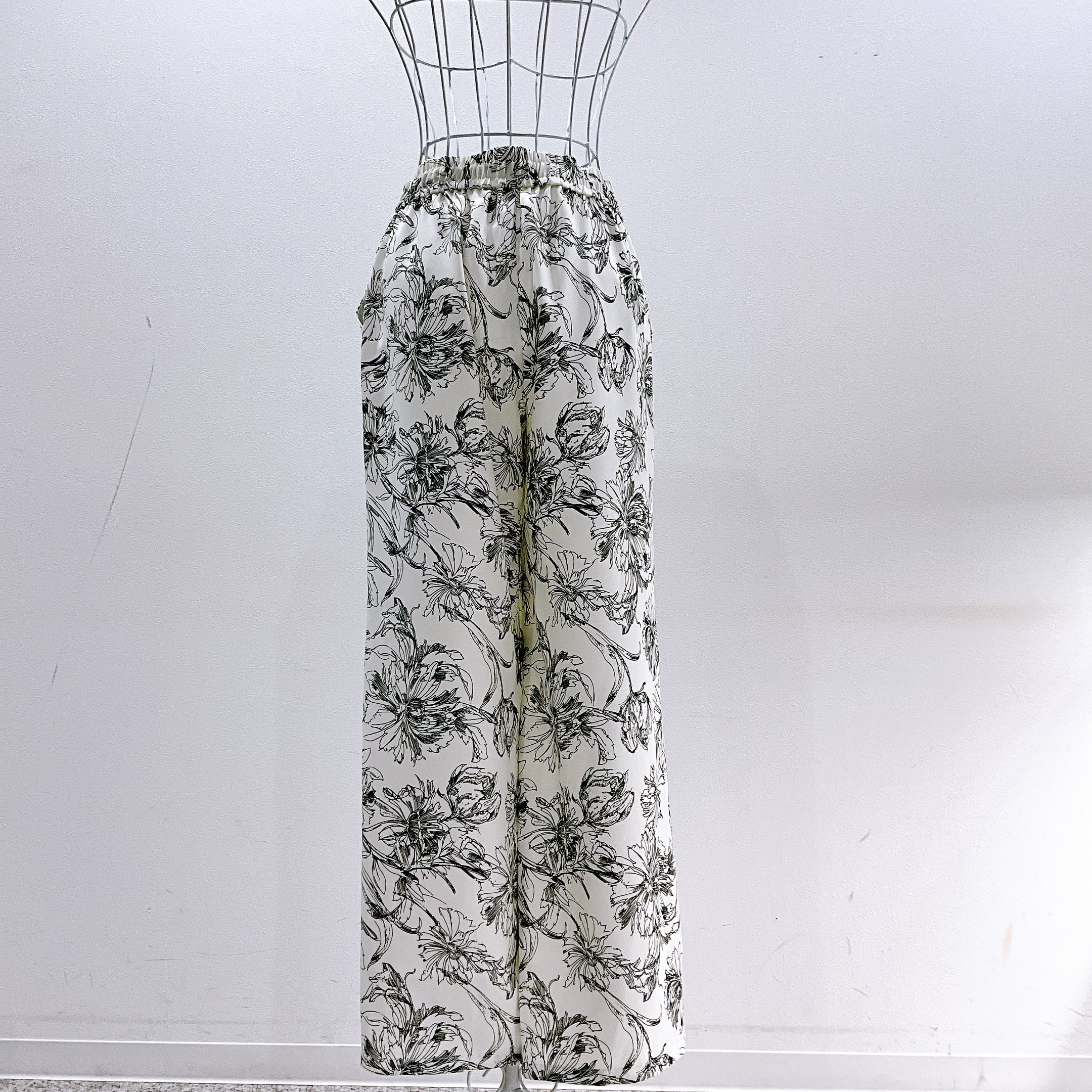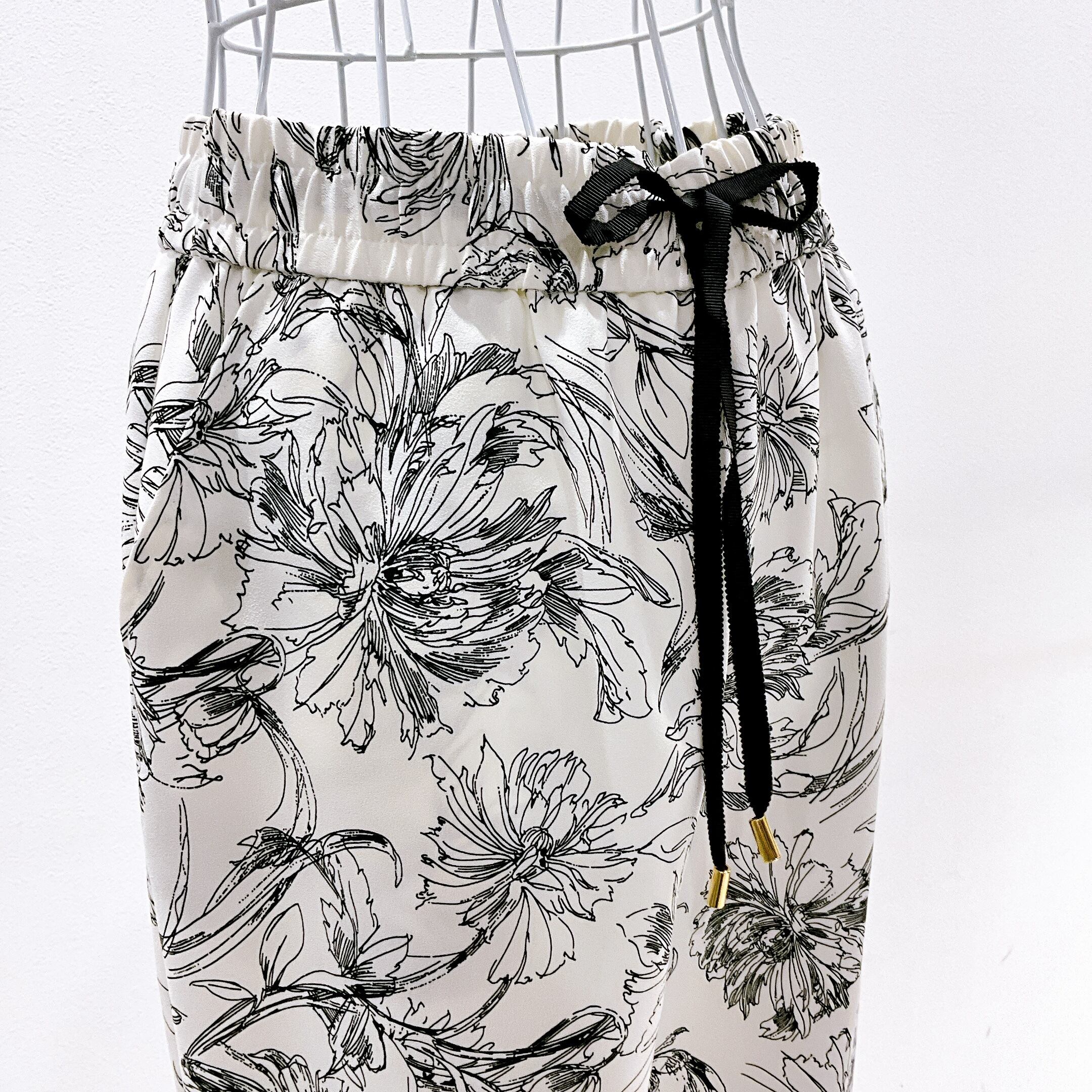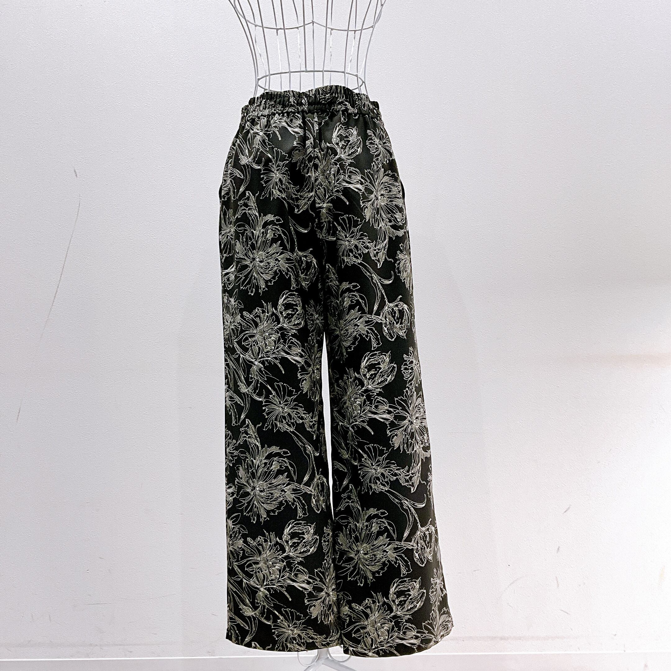 繊細な線画タッチのフラワープリントが目を惹く、大人の柄パンツ。