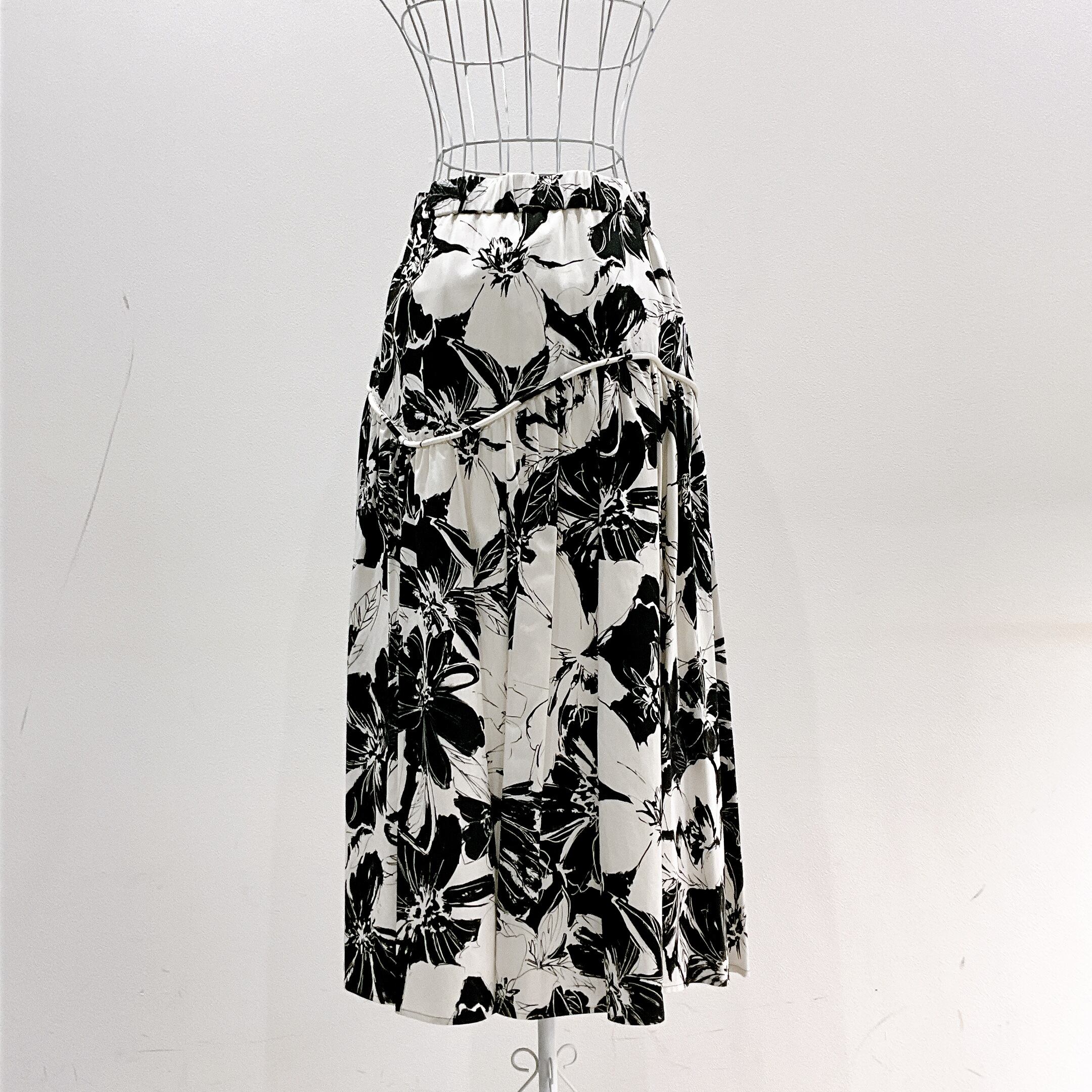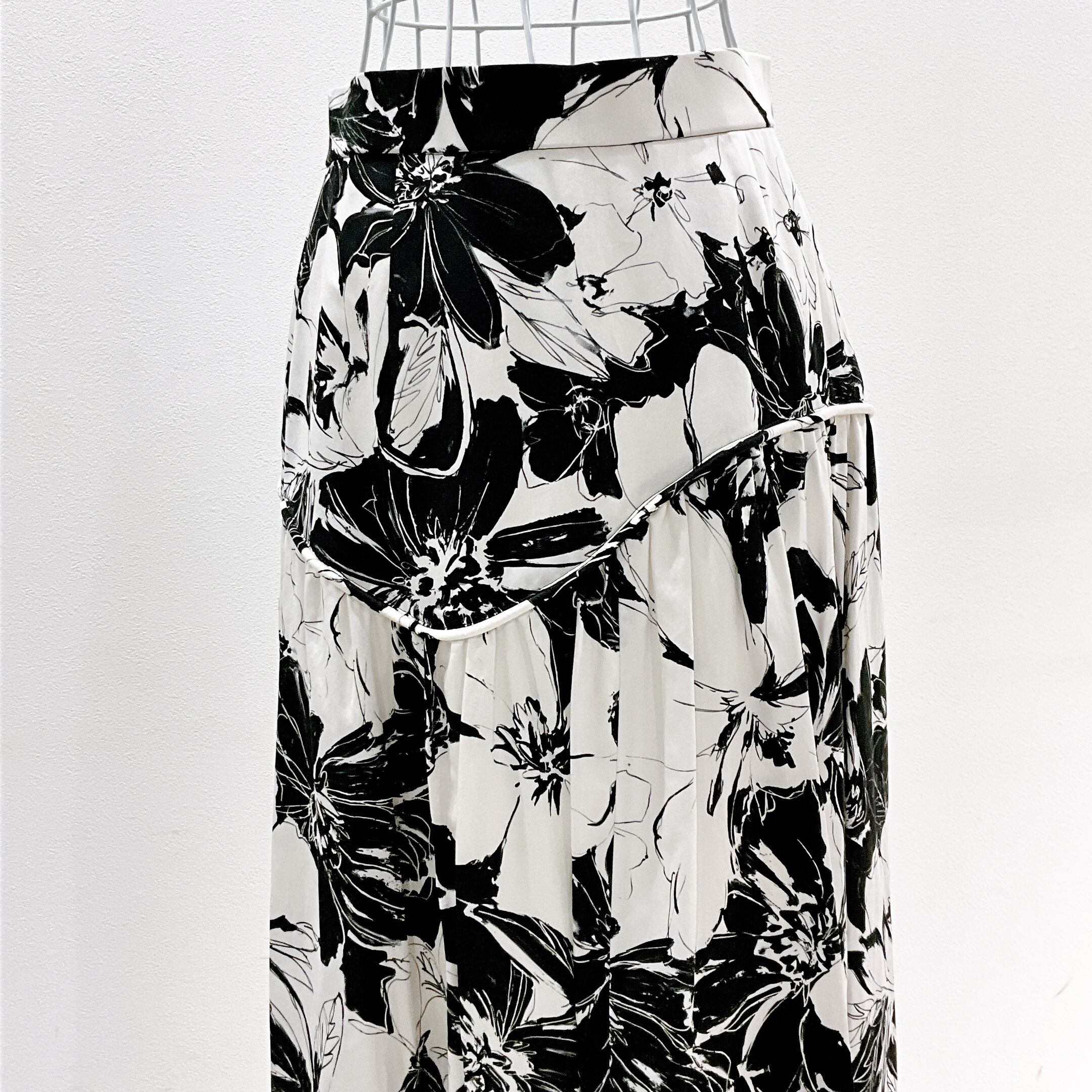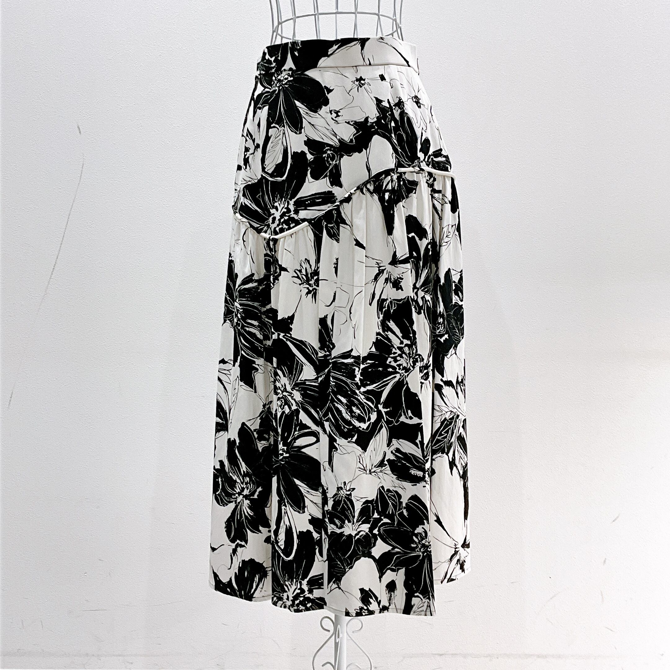 大胆なモノトーンフラワープリントが目を惹く、存在感のあるフレアスカート。