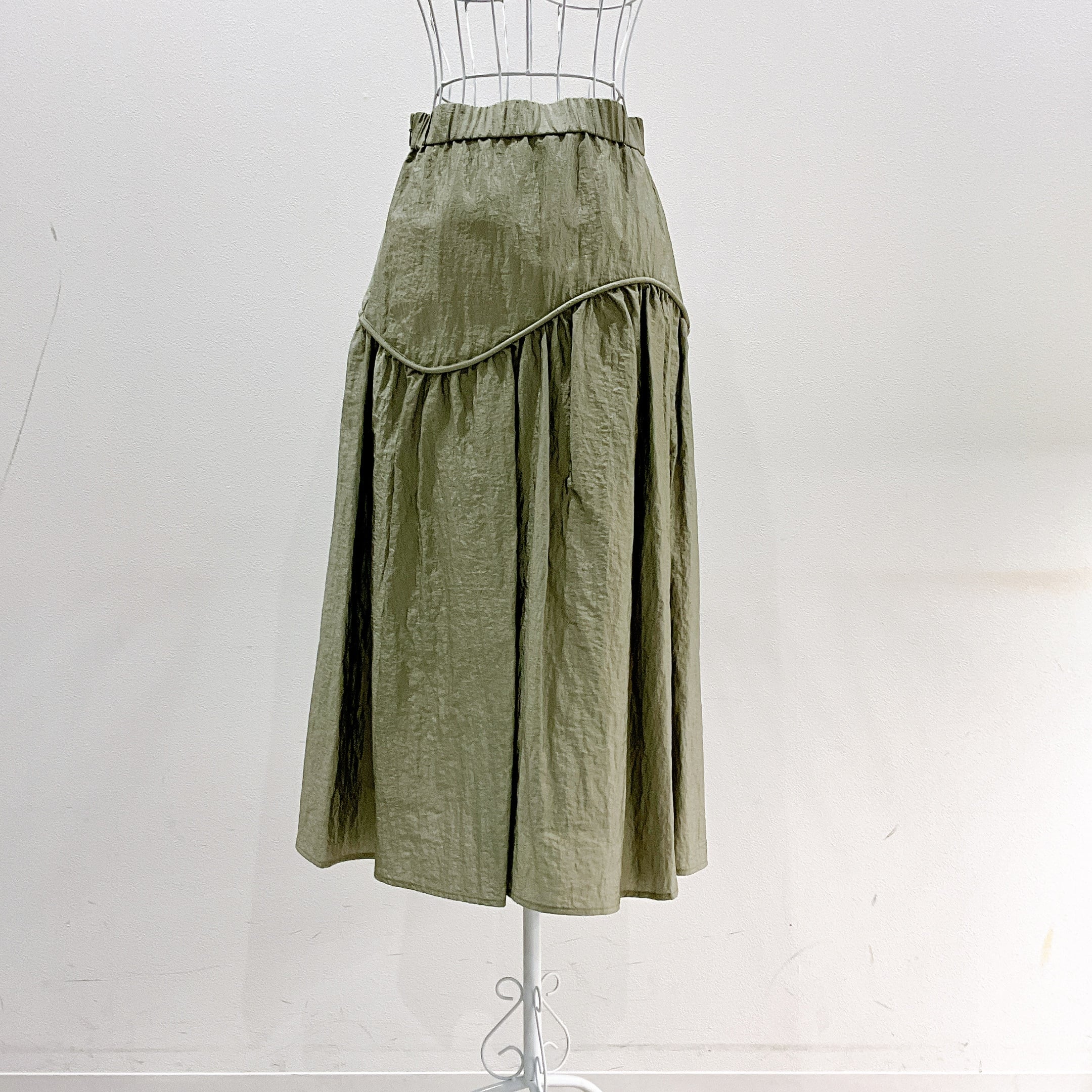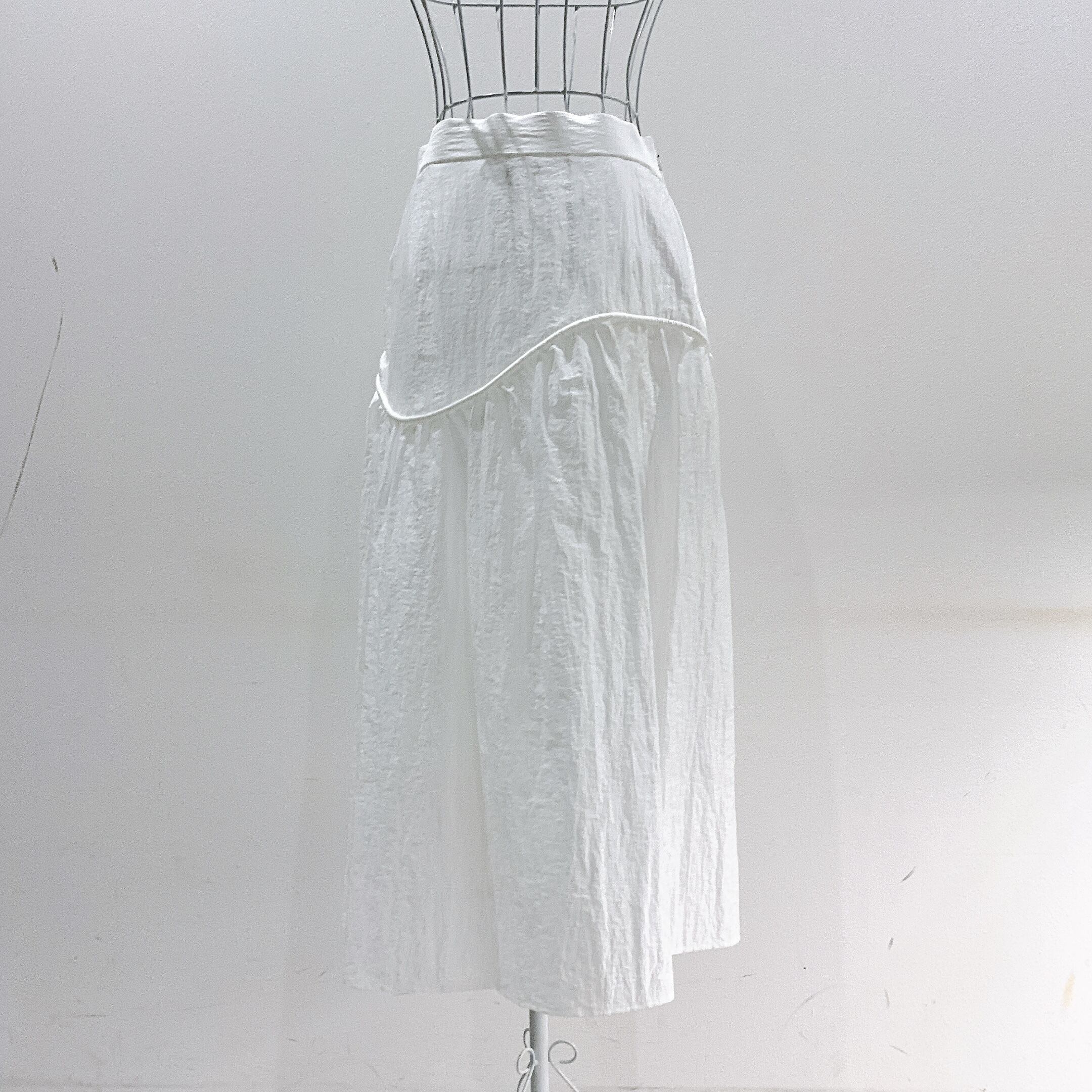 切り替えラインをアシンメトリーに入れることで、甘さを抑えつつ動きのあるデザインに。
