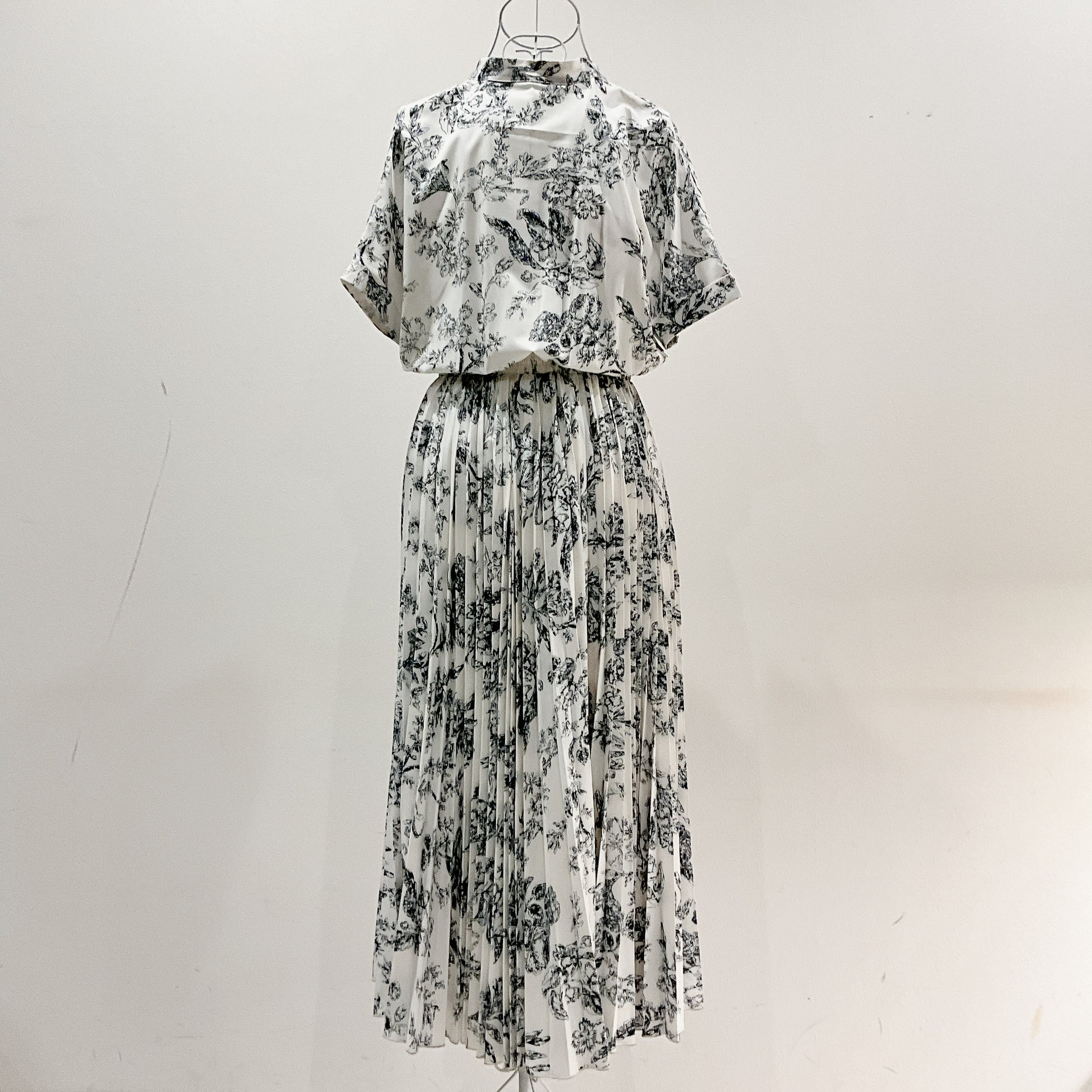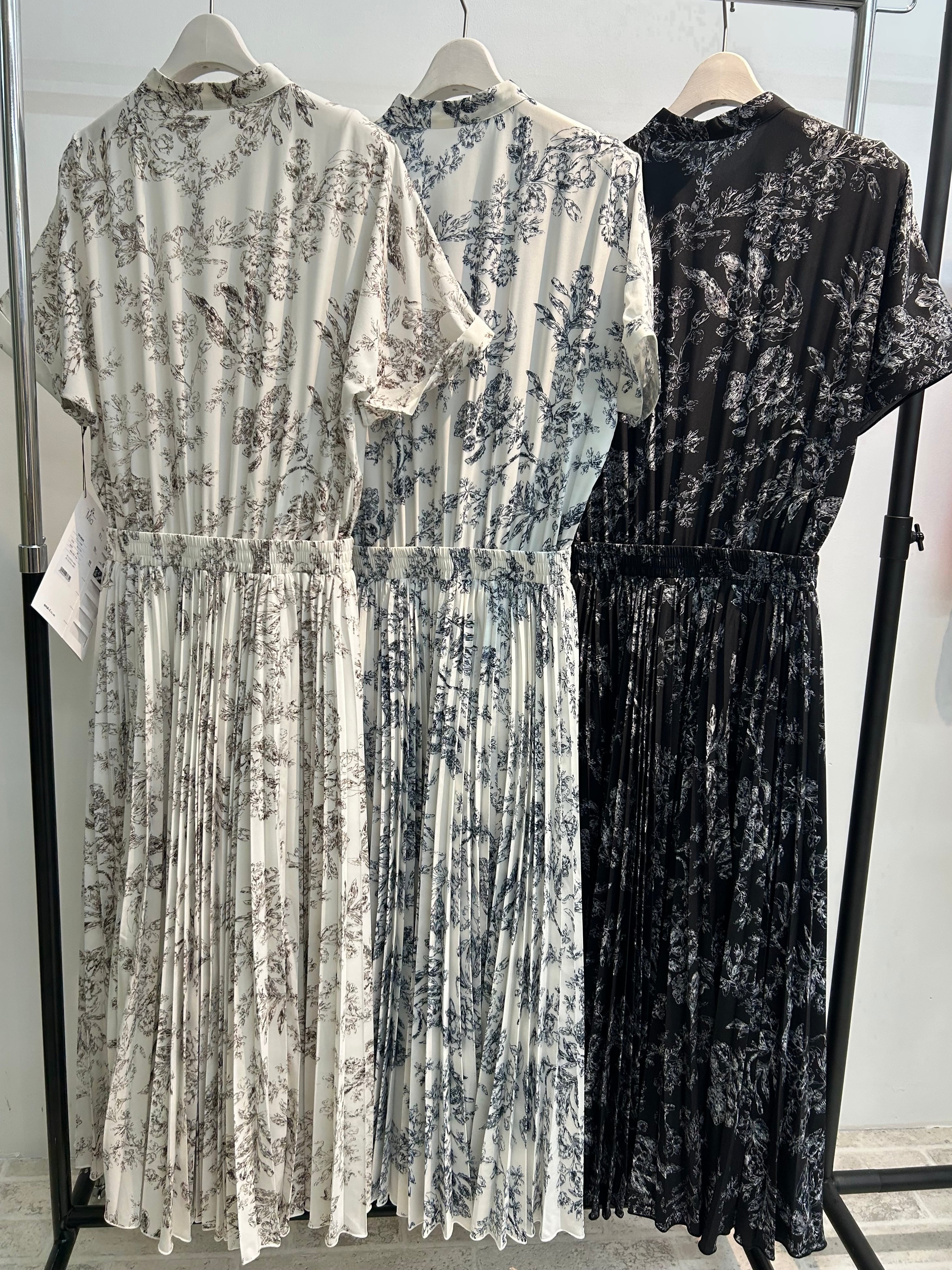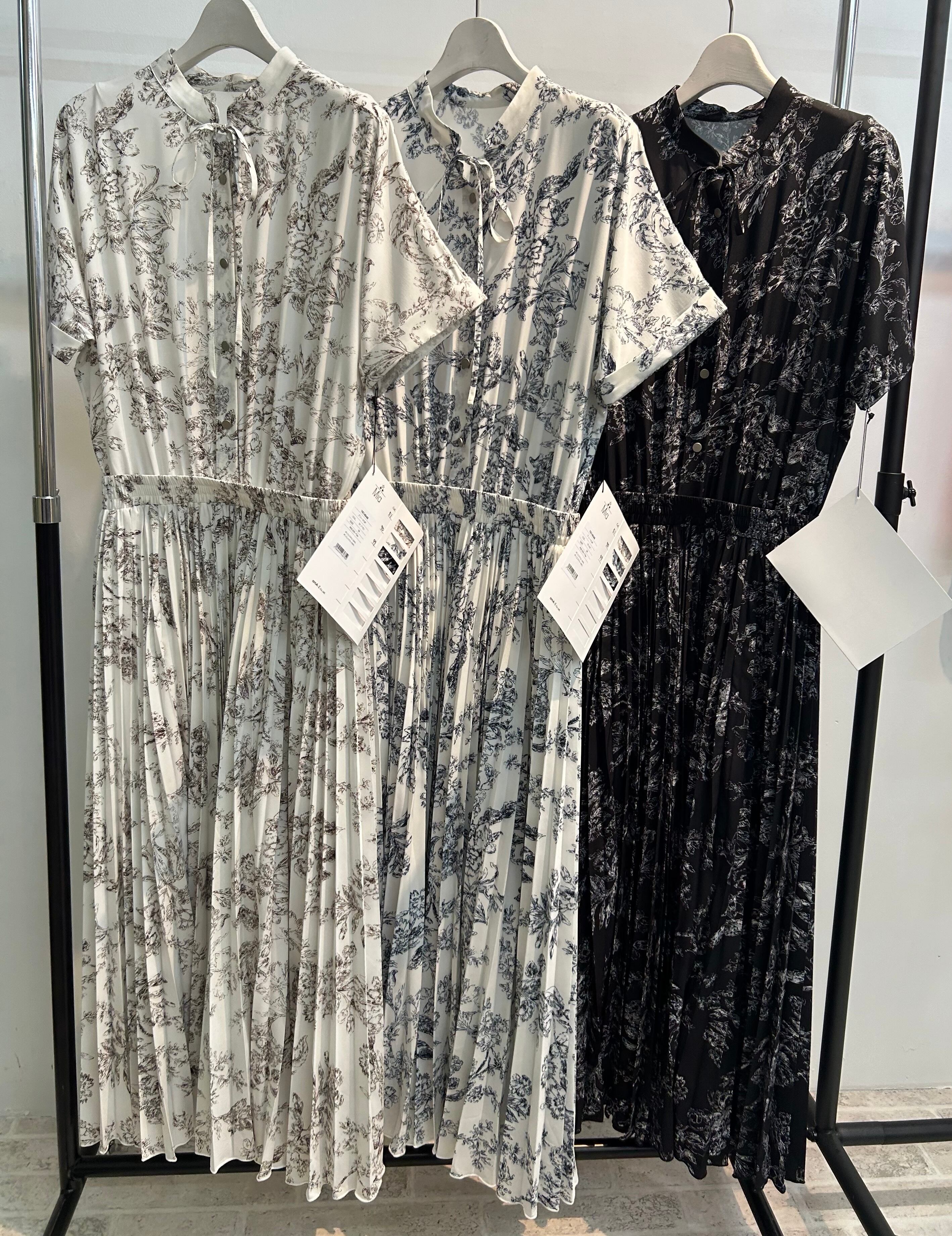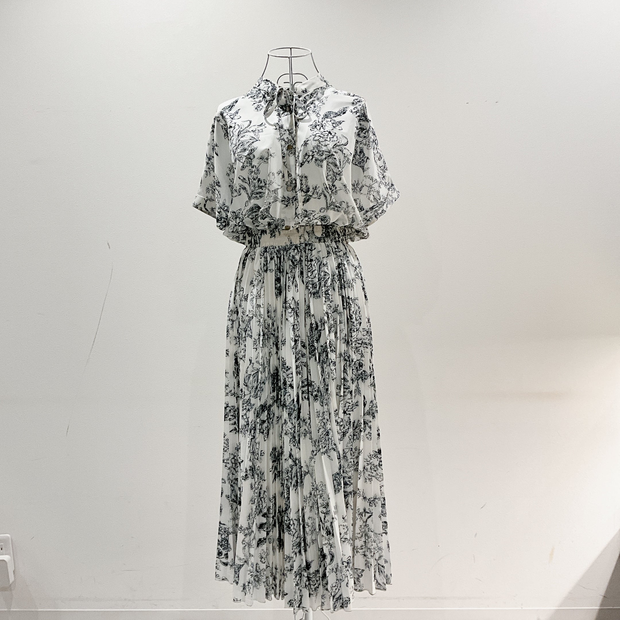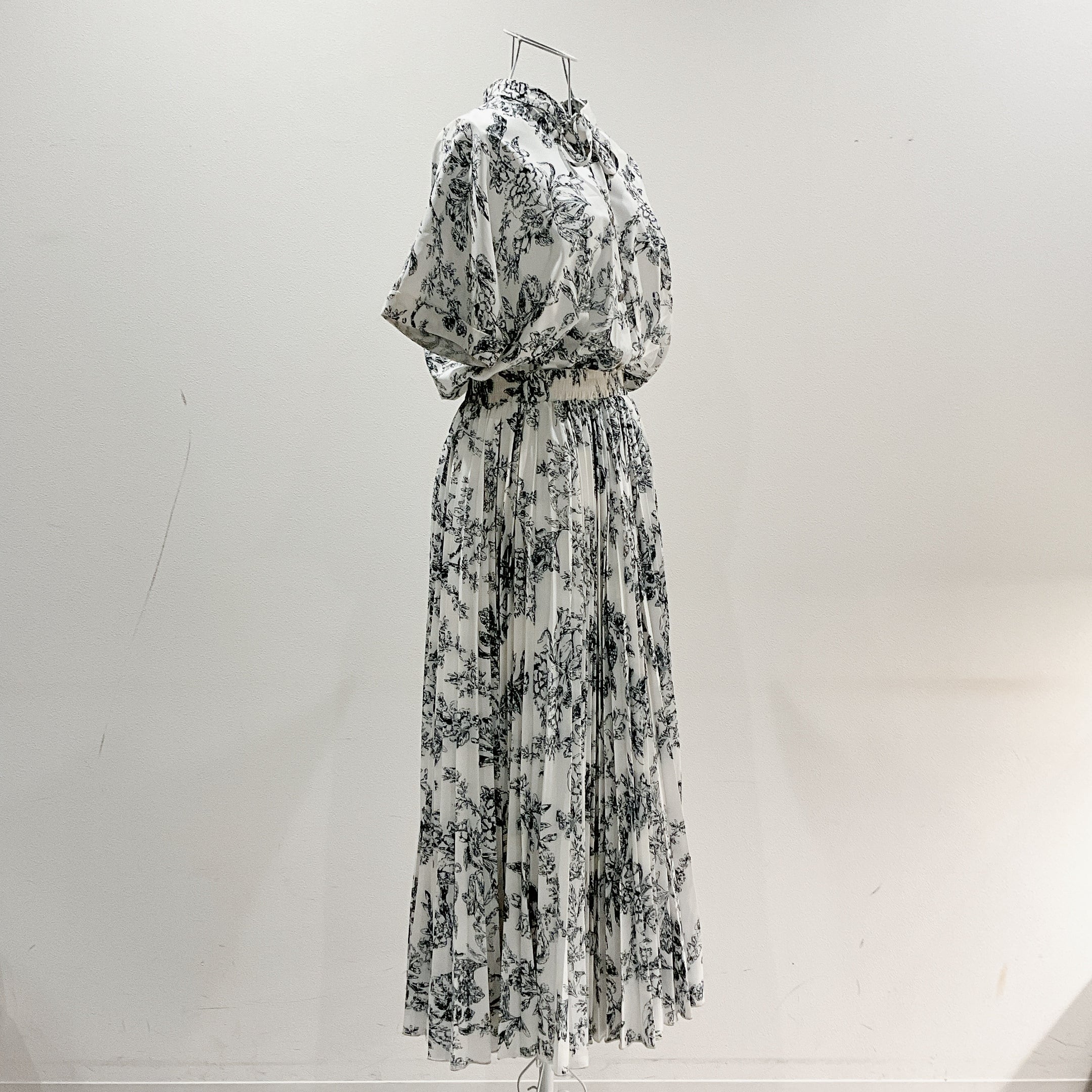 繊細なタッチで描かれたモノトーンフラワープリントが印象的な、プリーツワンピース。