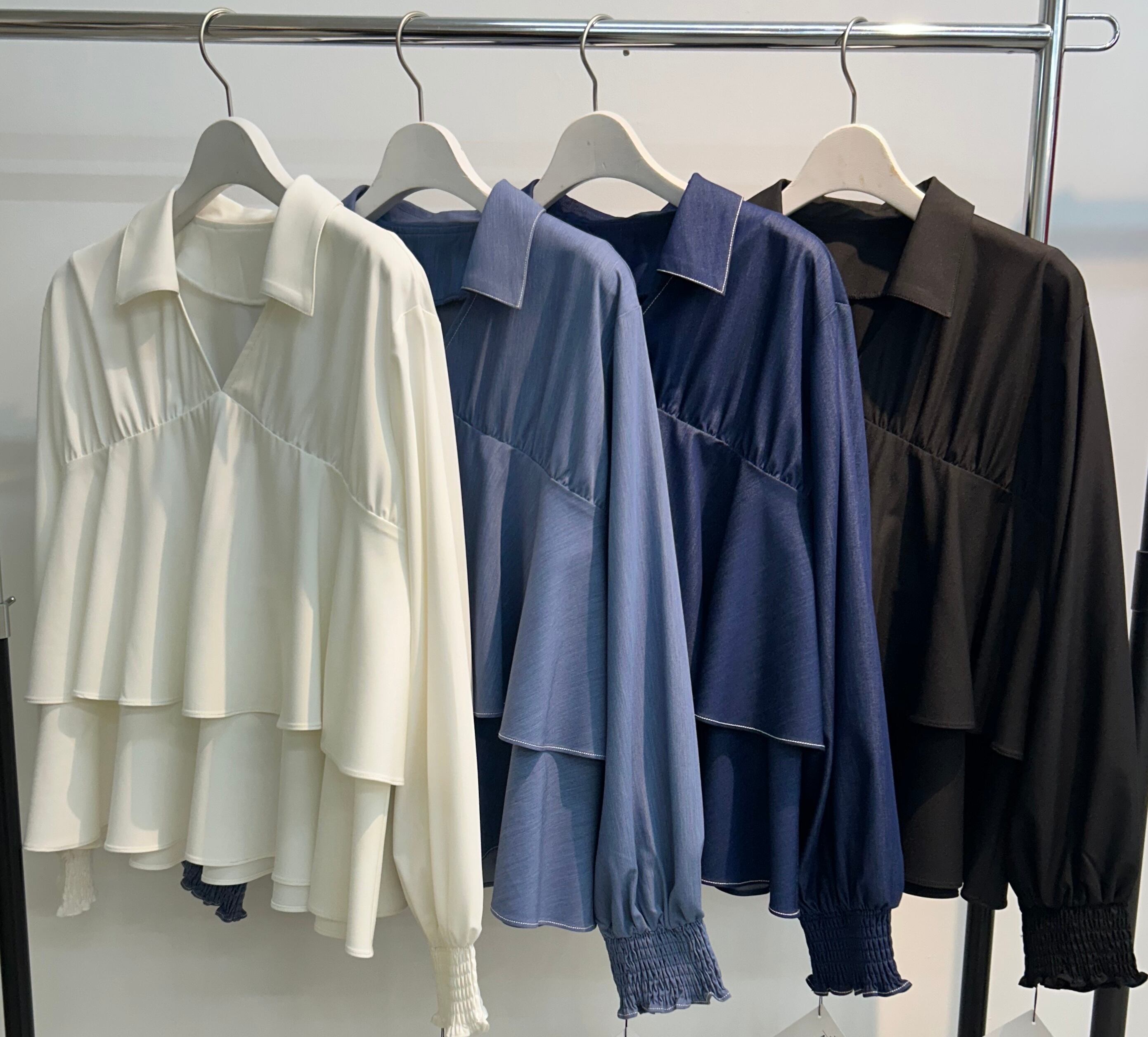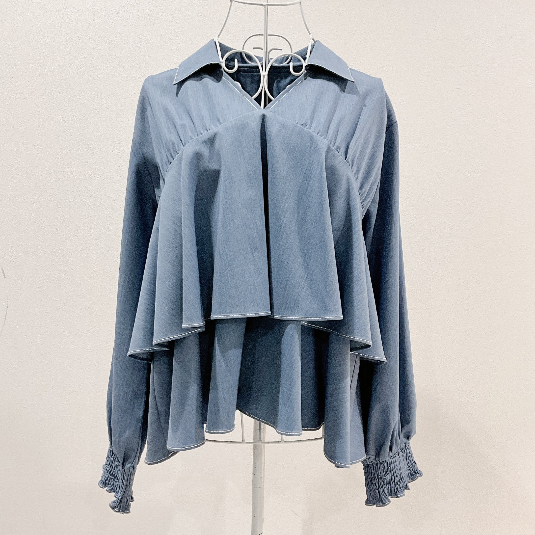 胸元から重なるように入ったフレアデザインが、動くたびにやさしく揺れ、シンプルなのに一枚で存在感のある仕上がりです。