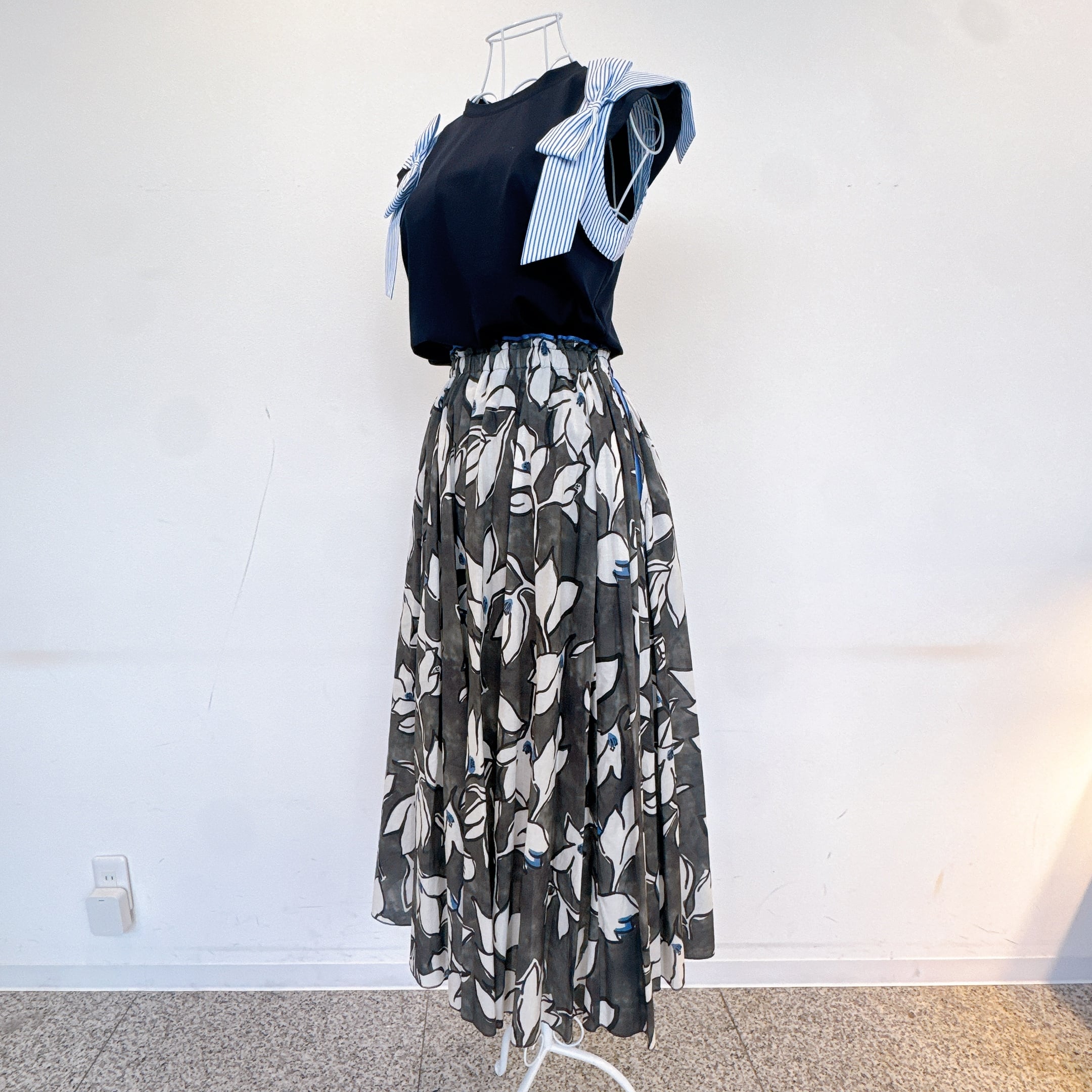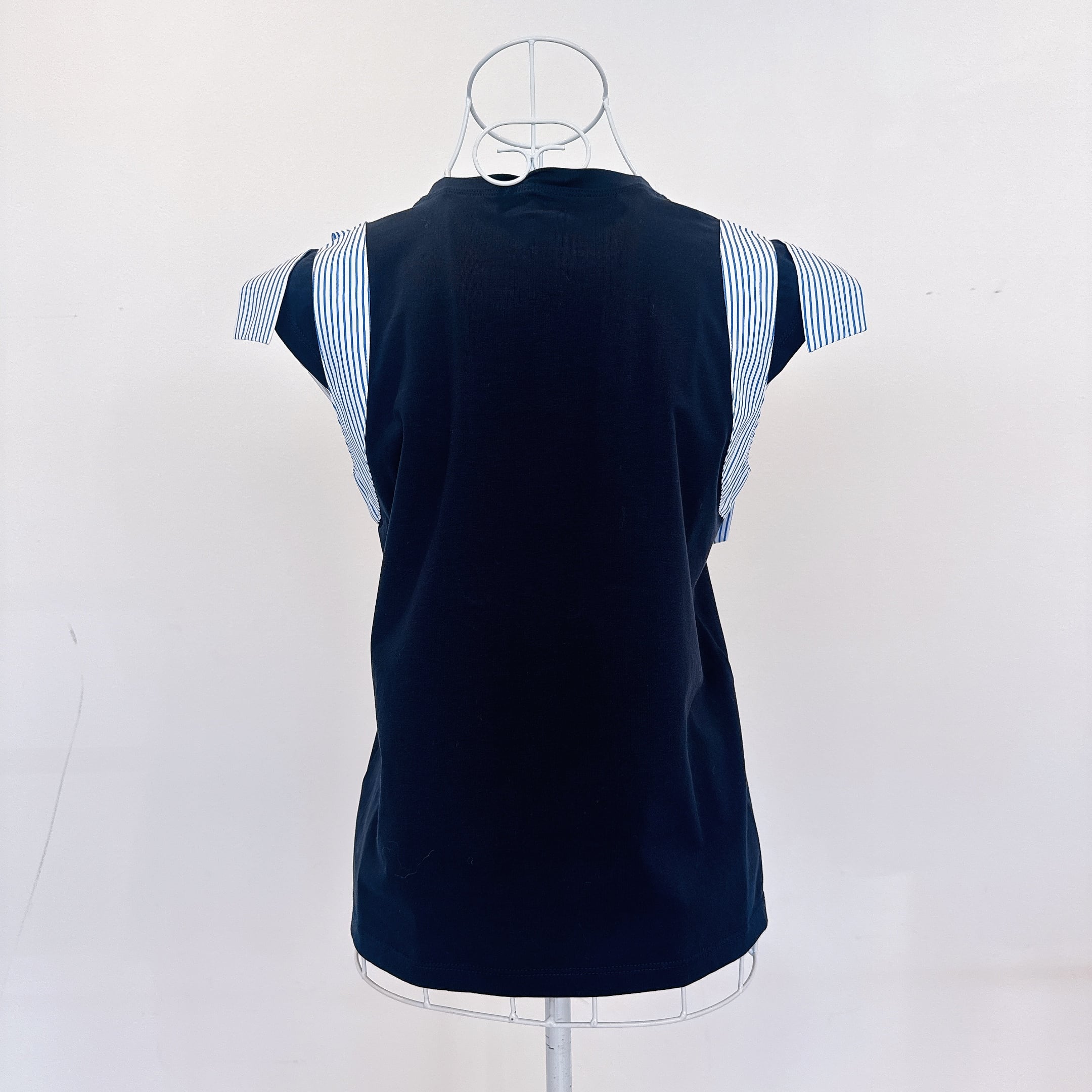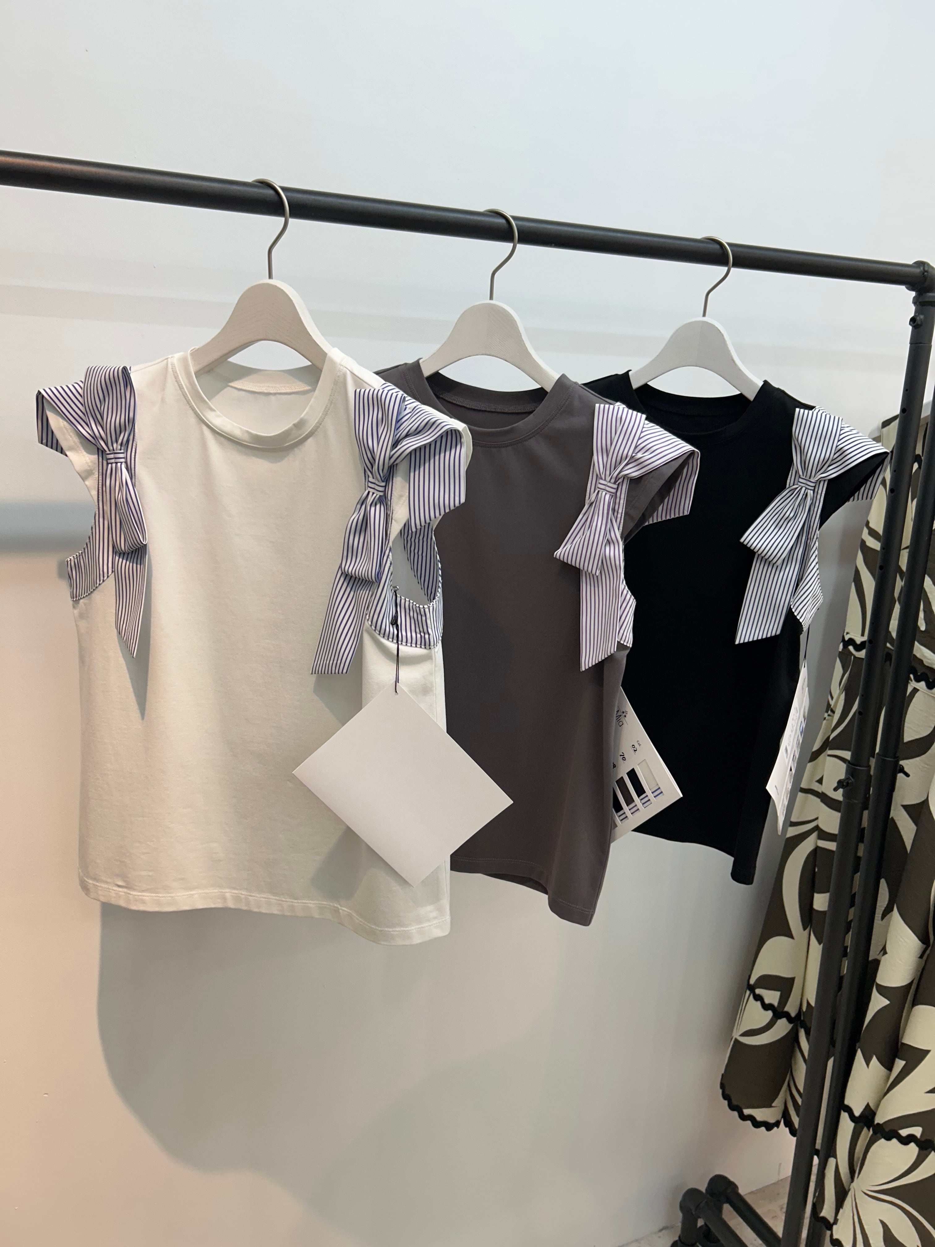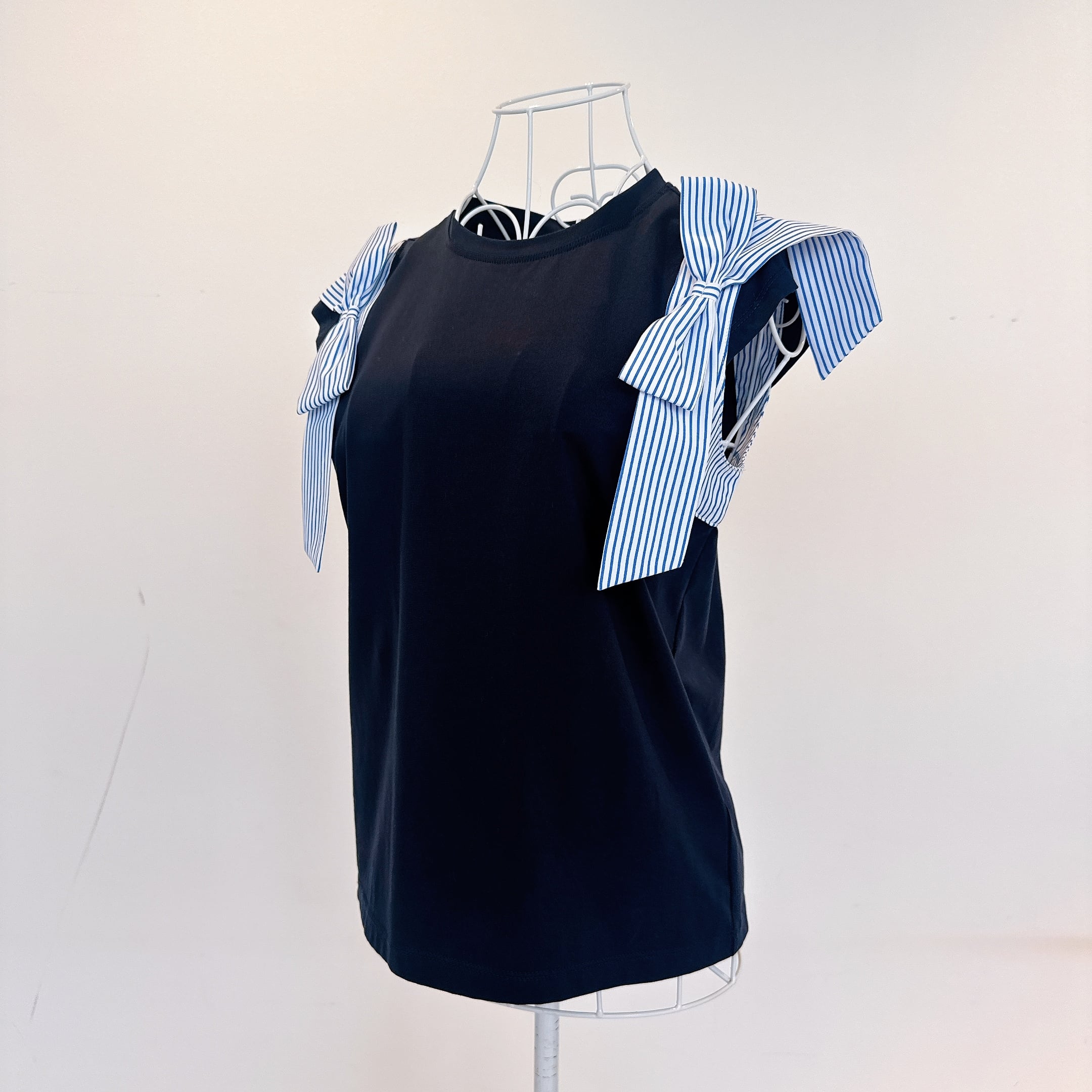 シンプルなカットソー素材に、シャツ生地のストライプリボンを組み合わせた