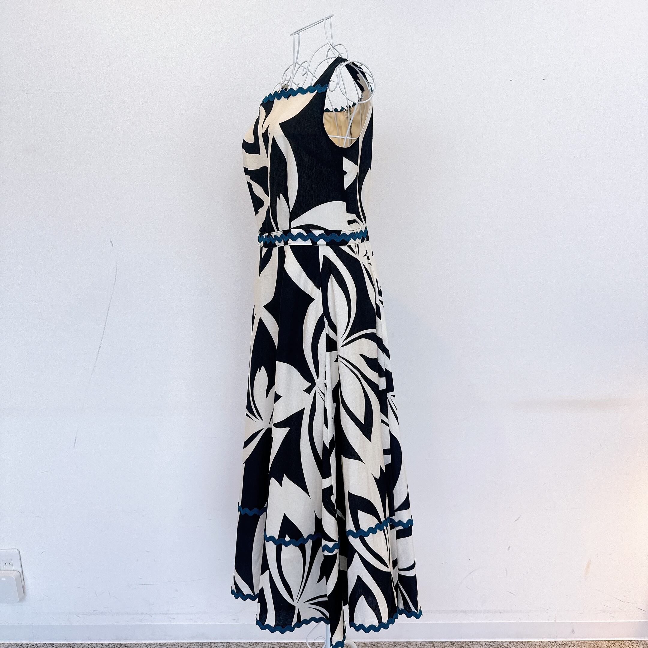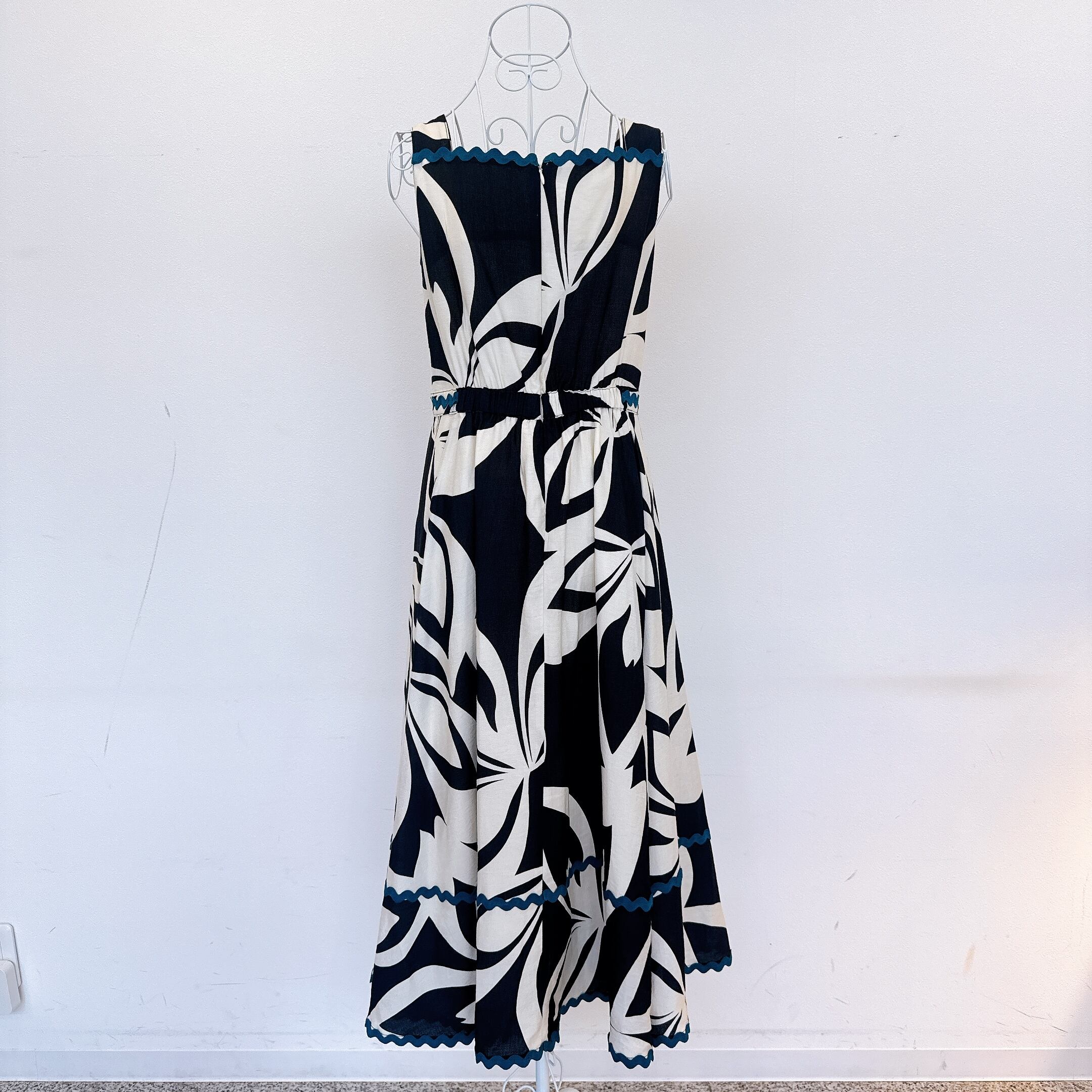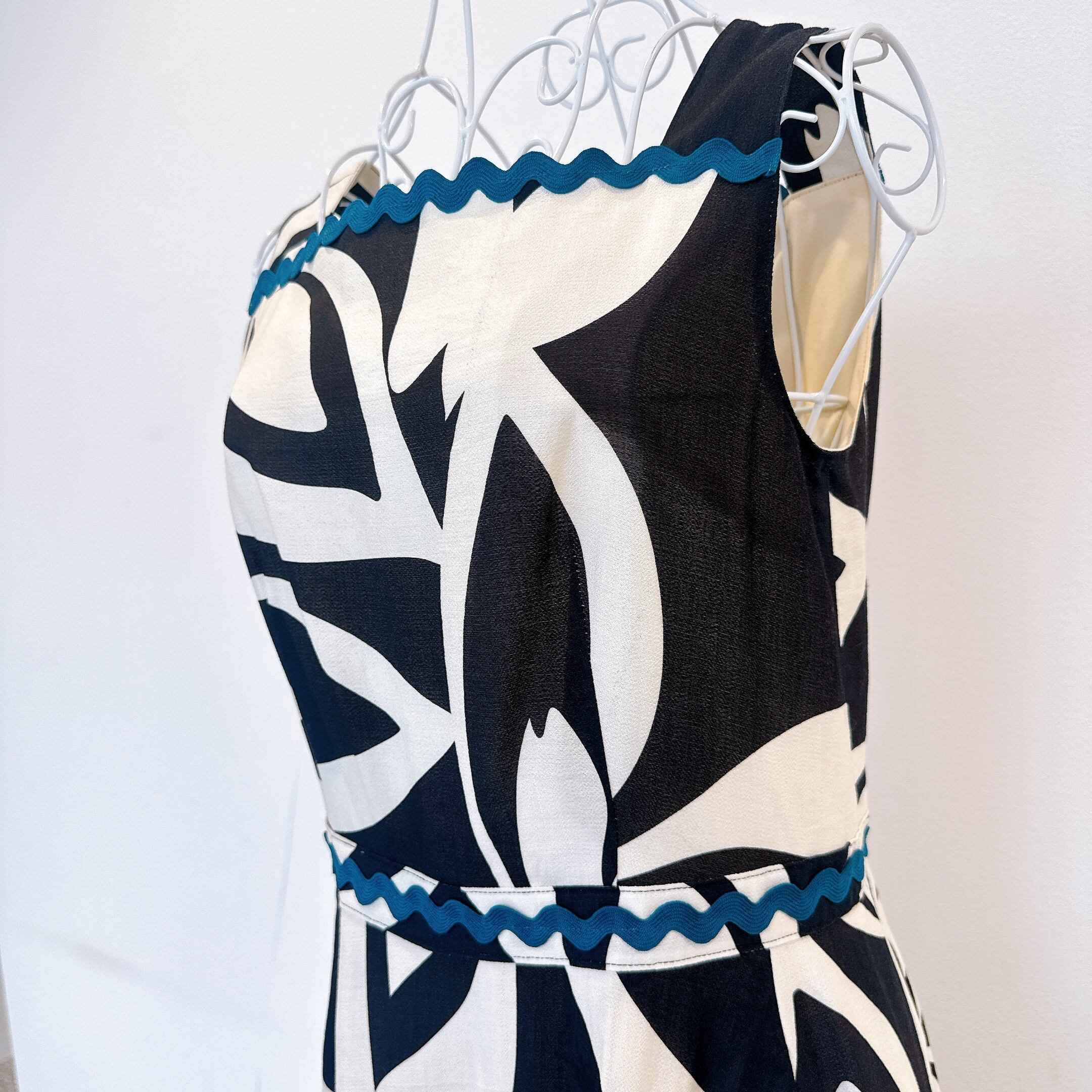 胸元やウエスト、裾には配色のスカラップテープを施し、