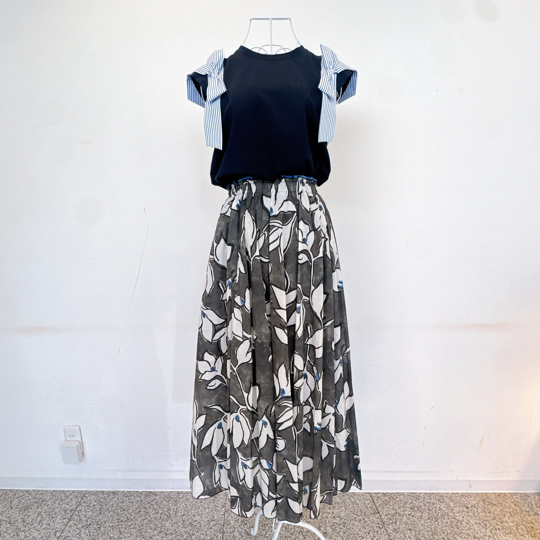 大きめの花柄が印象的で、シンプルなトップスと合わせるだけで