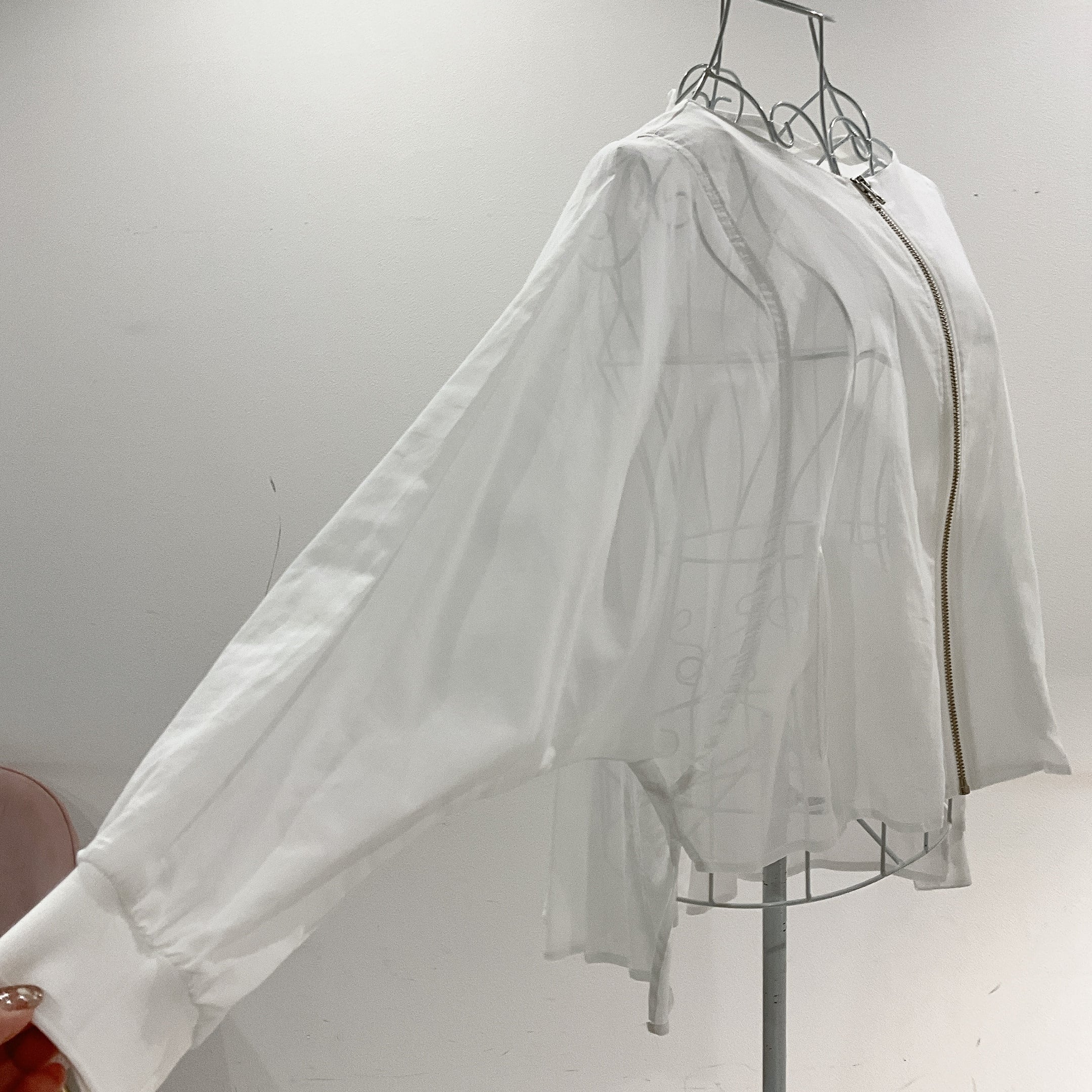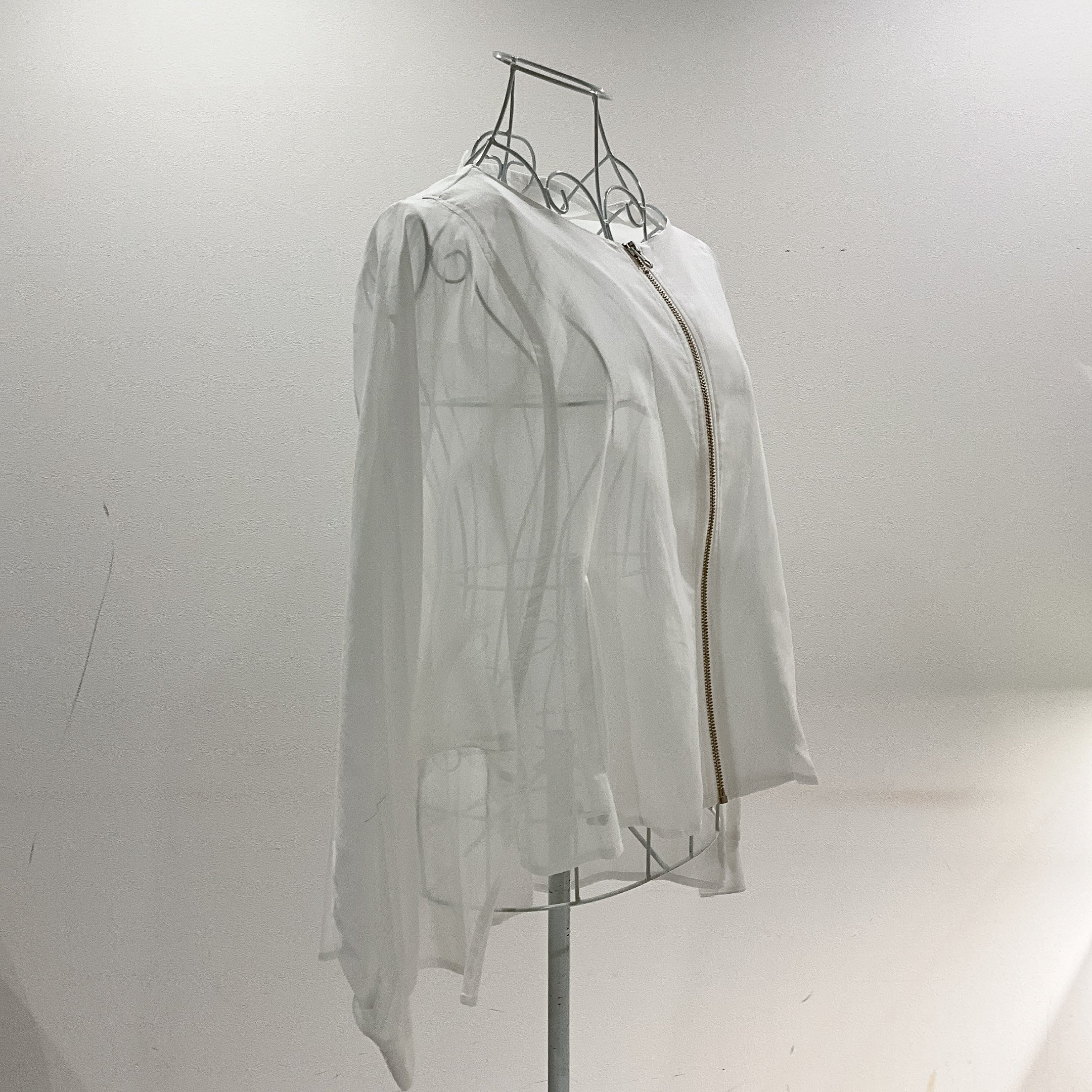 やわらかな透け感が魅力の、シアー素材を使用したジップブラウス。