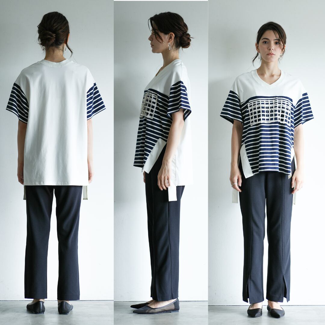 ボーダーの切り替えとドッキングしたレースがキャッチーなインパクトのオーバーTシャツ。