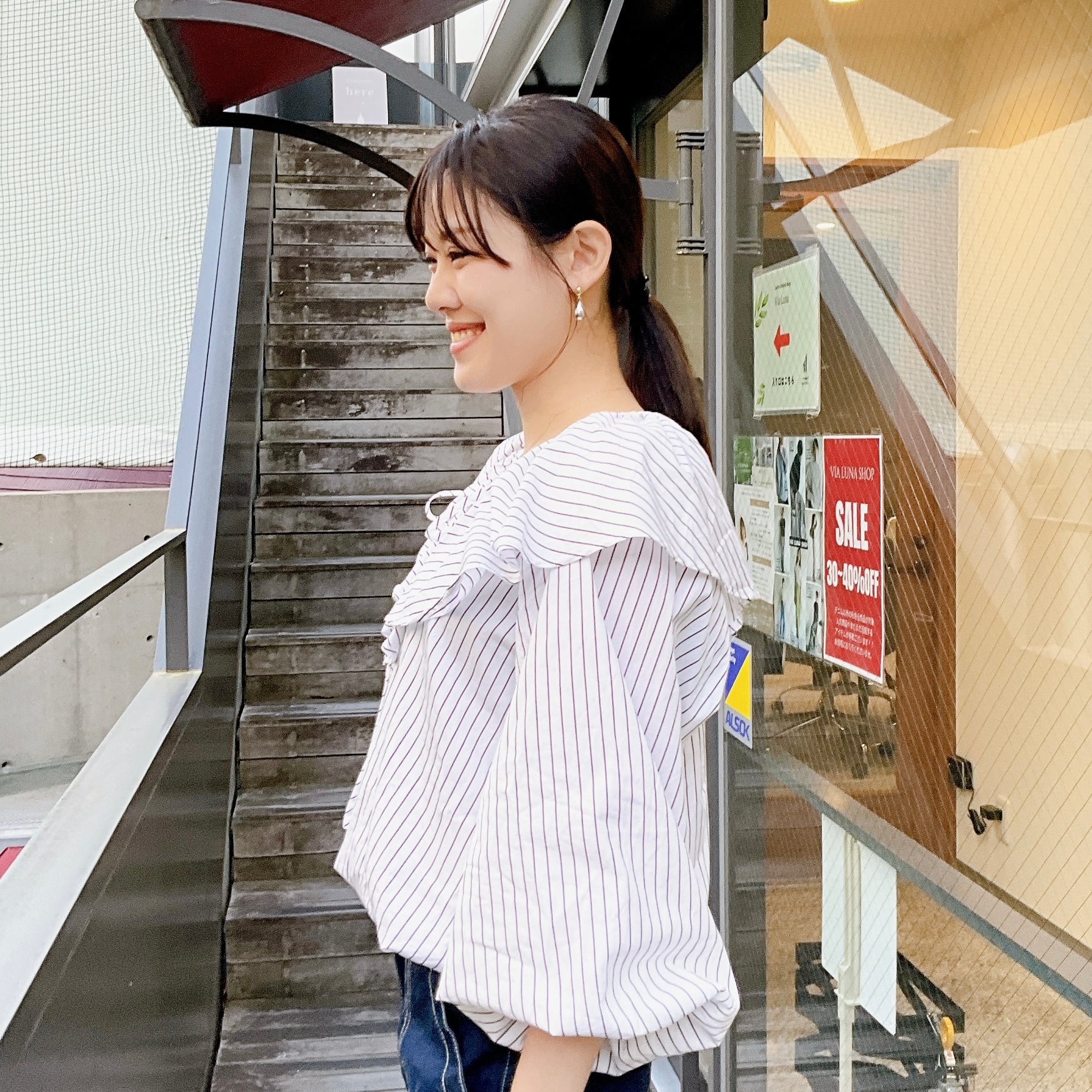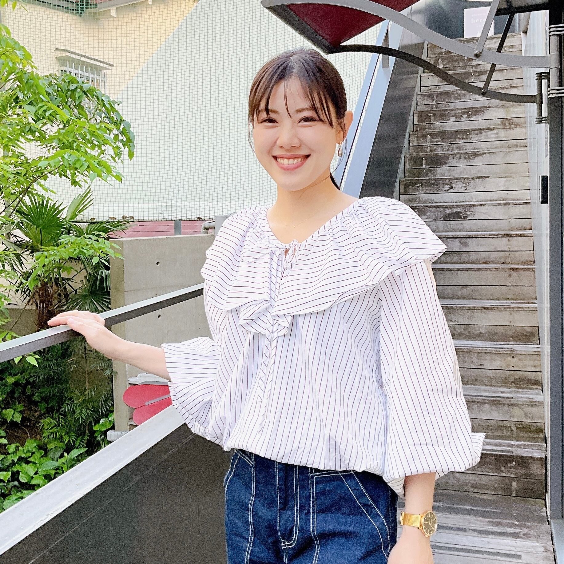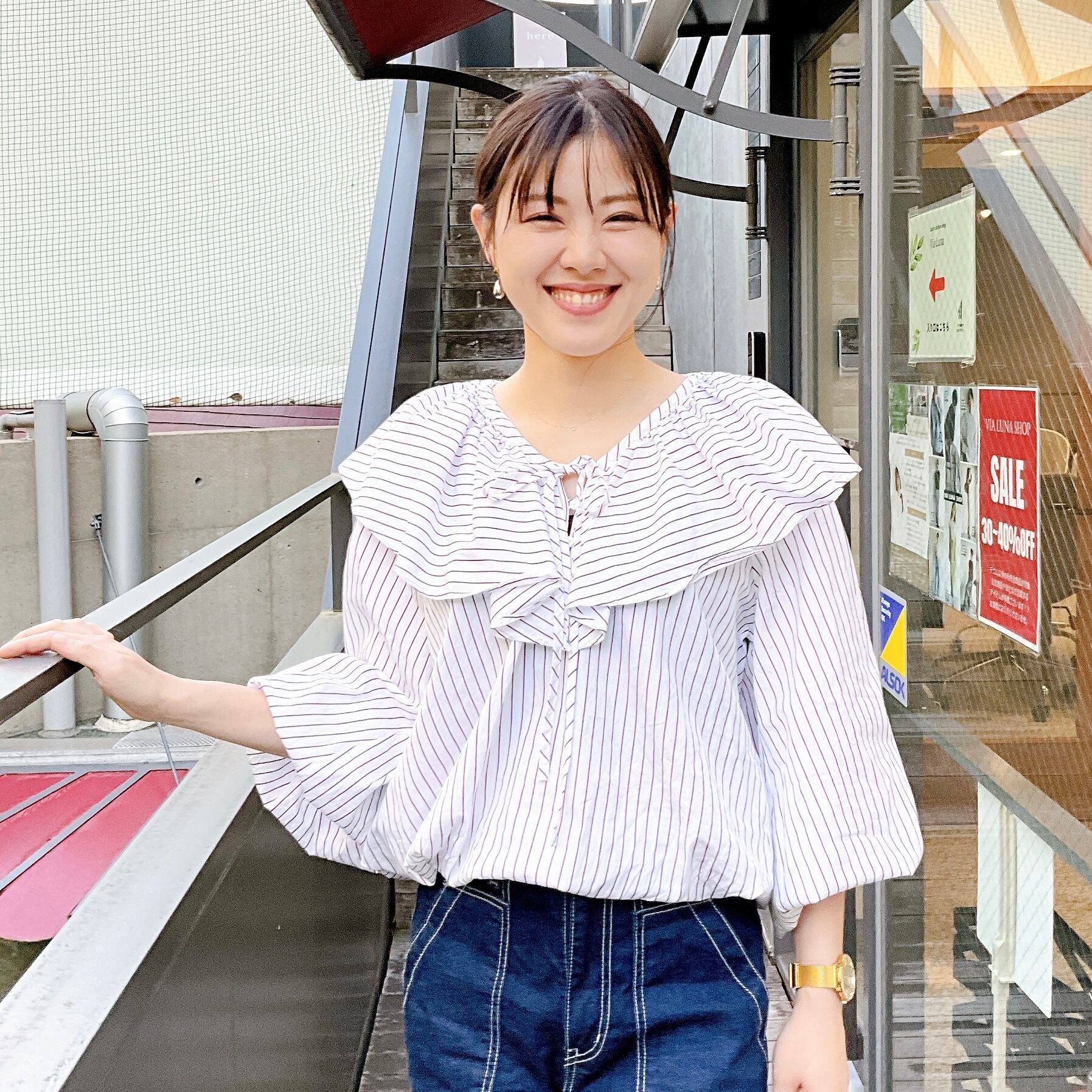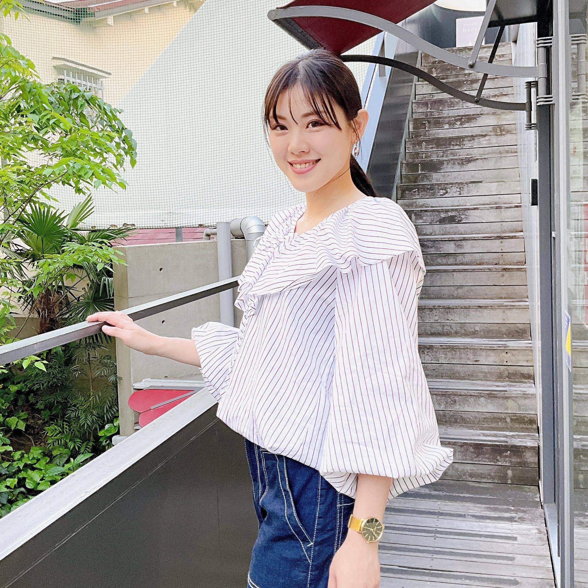 流れるようなラッフルが顔周りに華やぎを与えてくれるブラウスです。