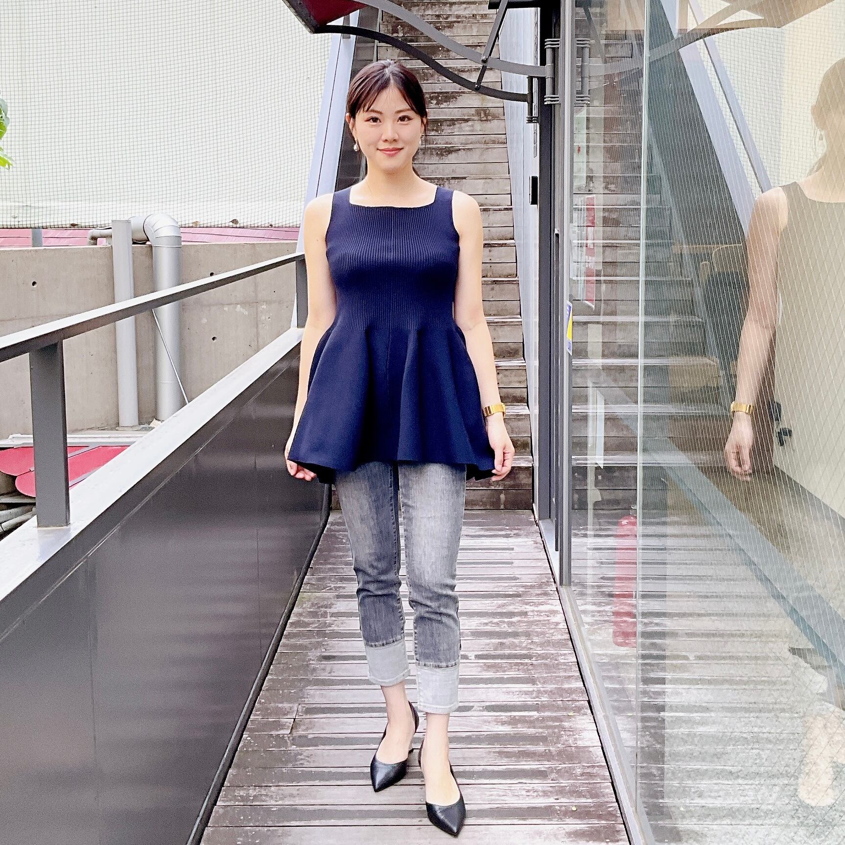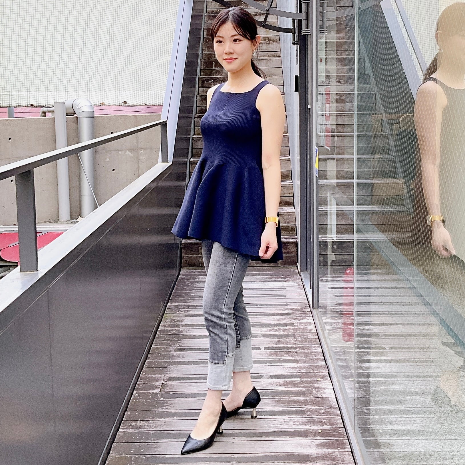 裾の折り返し風のデザインは前後で高さを少し違えることで